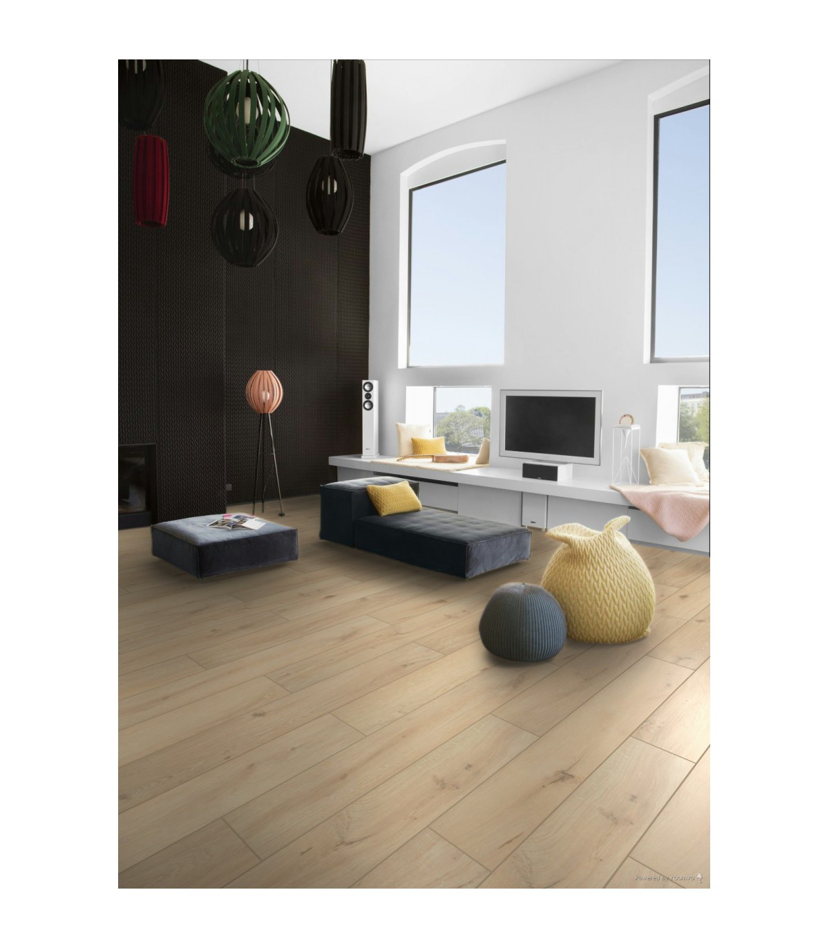 Le parquet stratifié Ocean+ Gyant Sand Natural se caractérise par une teinte de bois de couleur sable qui s'apparente au pin résineux, une teinte qui s'adaptera facilement à votre décoration d'intérieur. Le parquet Gyant sand natural est souvent utilisé pour créer un contraste avec une pièce aux murs blancs ou en pierre. Il s'associe très bien à des meubles en bois sombre.