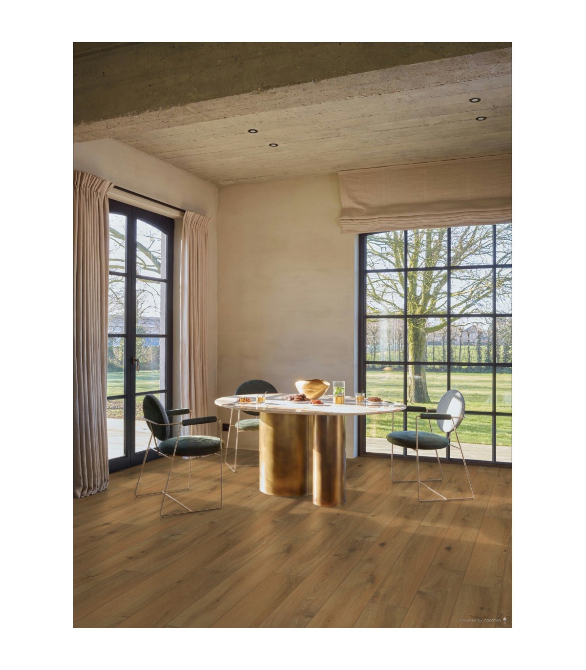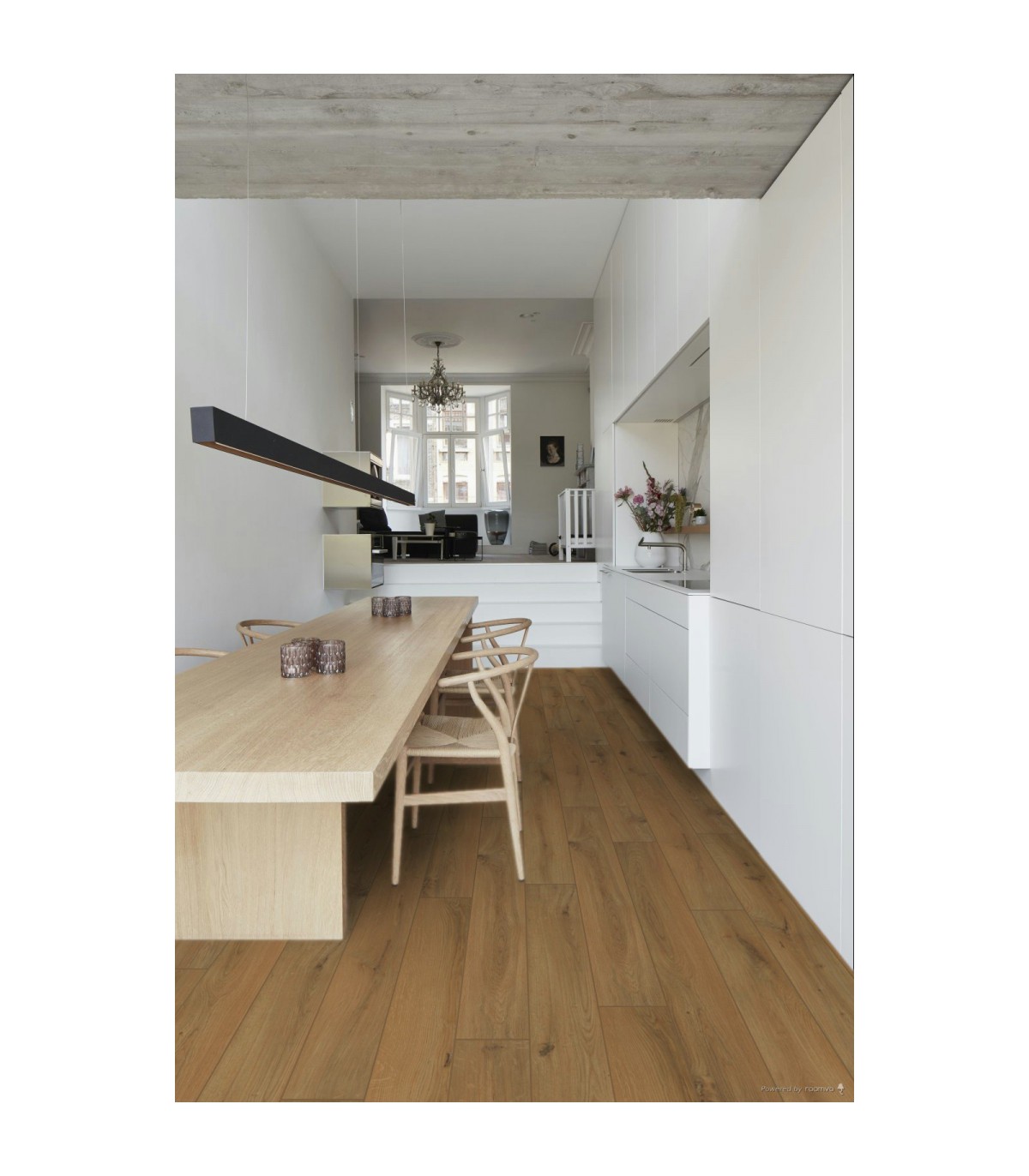 Le parquet stratifié Ocean+ Gyant Warm Natural se caractérise par une teinte de bois beige clair, une teinte naturel qui s'adaptera facilement à votre décoration d'intérieur. Le parquet Gyant Warm Natural ait apparaitre le motif naturel du bois et est souvent utilisé pour créer un contraste avec une pièce aux murs blancs ou noirs. Il s'associe très bien à des meubles en bois sombre ou à des meubles blancs.
