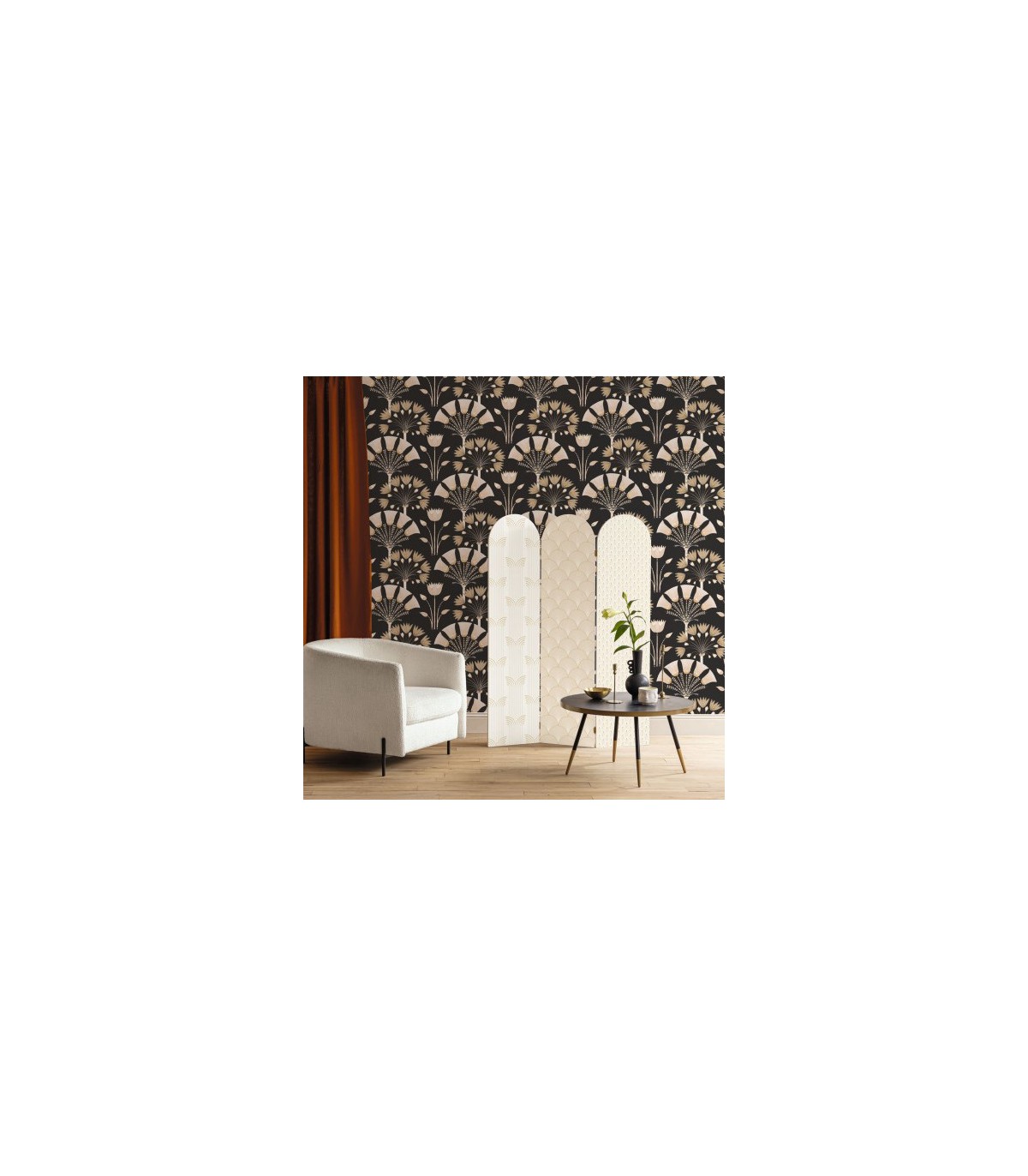 Plus qu’un simple revêtement mural, ce papier peint se vit comme une matière décorative. Les nuances dorées apportent une touche sophistiquée sans jamais être ostentatoires. En solo sur un mur complet, il enveloppe l’espace d’une aura apaisante. En association avec des papiers peints à motifs ou des matières naturelles comme le bois clair, le rotin ou la pierre, il devient un contrepoint élégant, jouant avec les contrastes et les textures.
