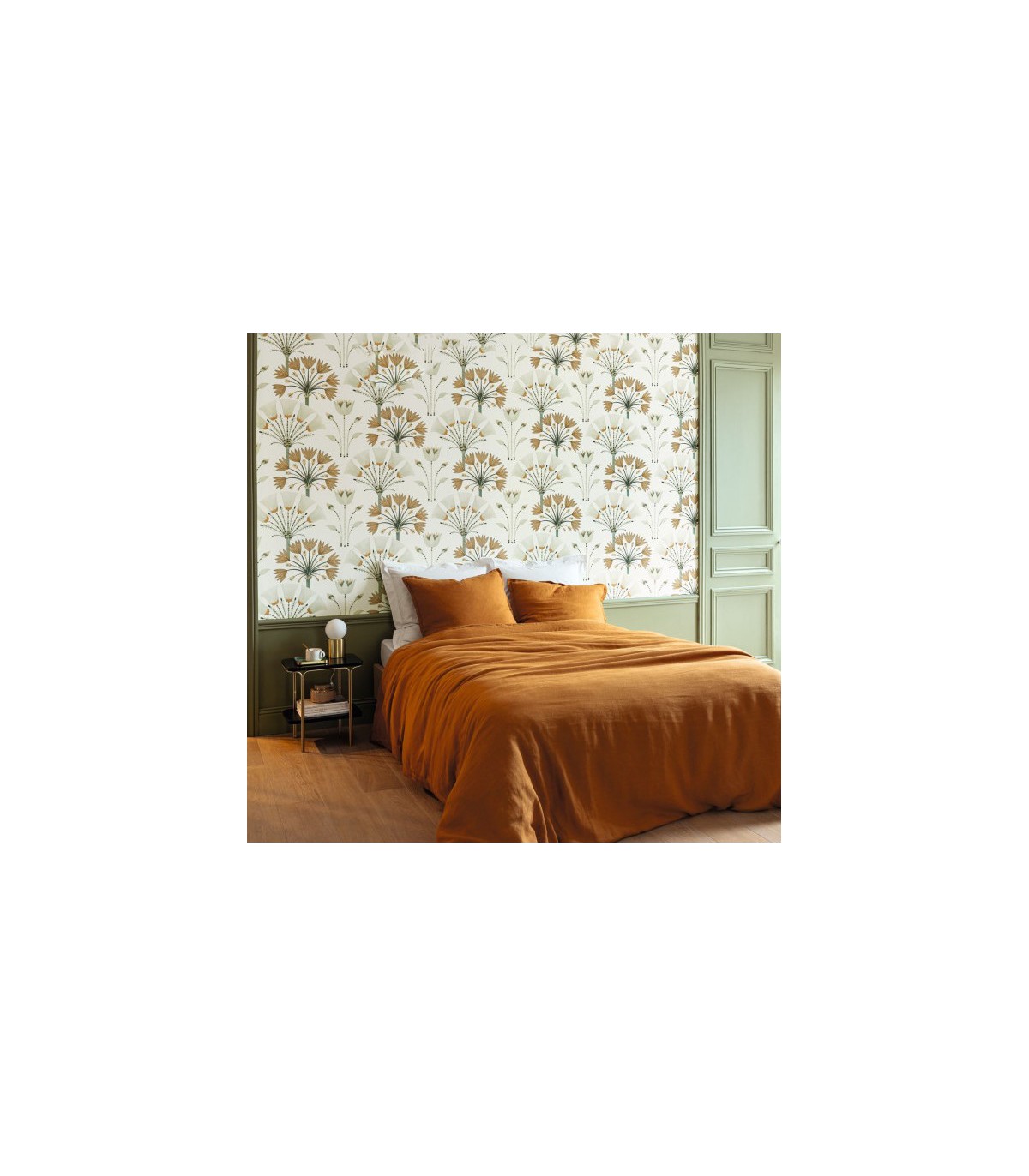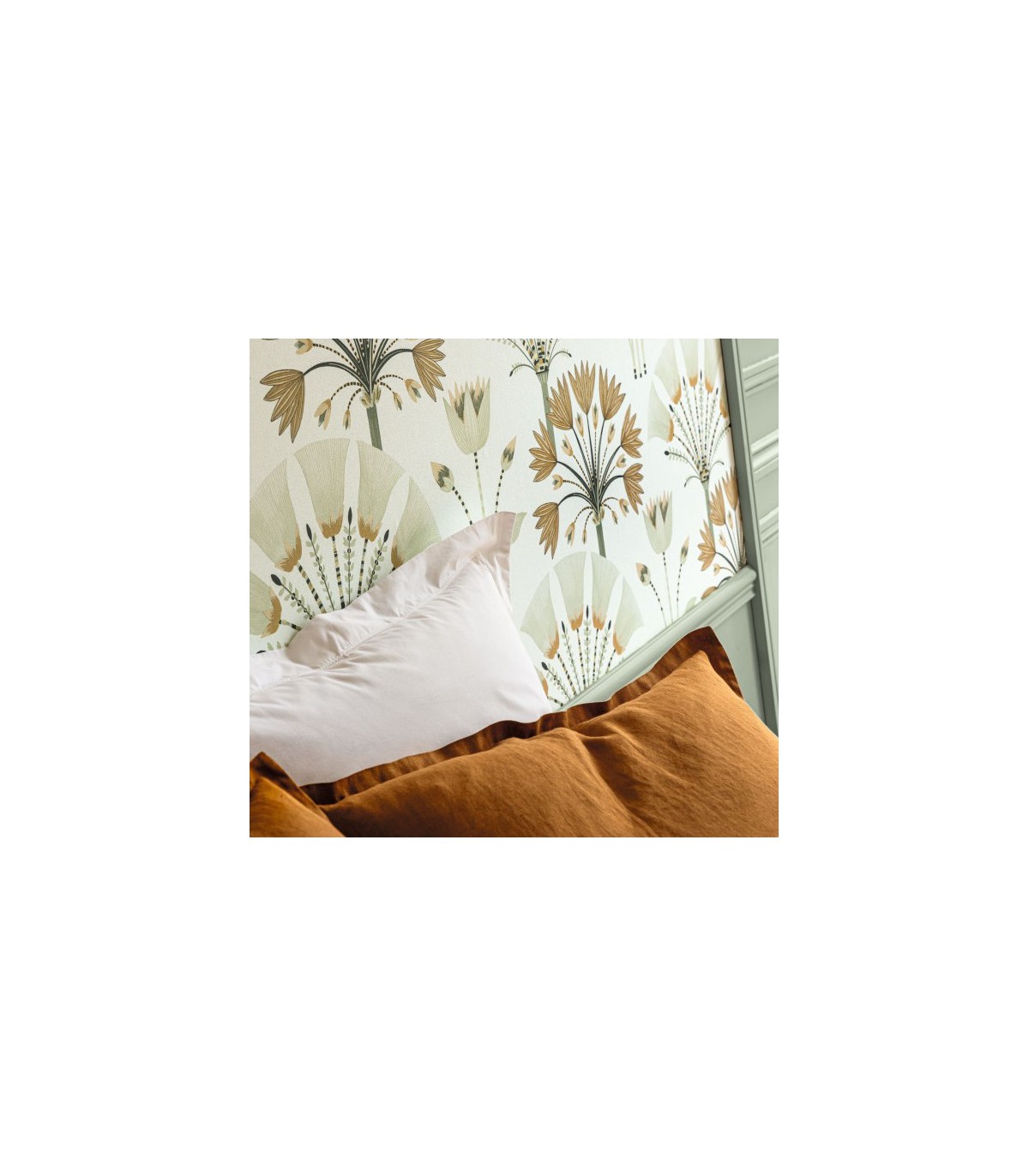 Plus qu’un simple revêtement mural, ce papier peint se vit comme une matière décorative. Les nuances dorées apportent une touche sophistiquée sans jamais être ostentatoires. En solo sur un mur complet, il enveloppe l’espace d’une aura apaisante. En association avec des papiers peints à motifs ou des matières naturelles comme le bois clair, le rotin ou la pierre, il devient un contrepoint élégant, jouant avec les contrastes et les textures.