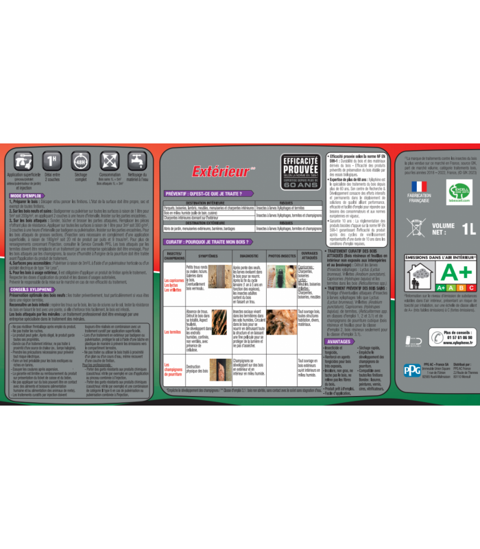 Traitement en phase aqueuse, facile d’application et répond à tous les problèmes du bois selon la destination. Idéal pour un traitement curatif des bois attaqués. Détruit totalement les larves xylophages et termites. Prévient toute réinfection.