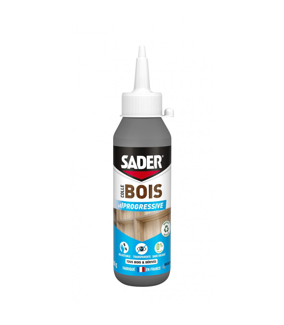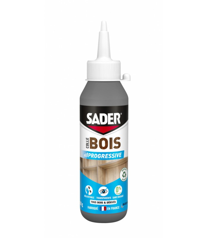 La colle bois prise progressive SADER est une colle vinylique blanche pour l'assemblage et le placage en intérieur de tous types de bois (toutes essences) et leurs dérivés : bois tendres, exotiques, contreplaqués, agglomérés, lamifiés, stratifiés..... Elle est spécialement recommandée pour les travaux de précision et de menuiserie. Convient également pour les petits collages : papier, carton, feutrine...