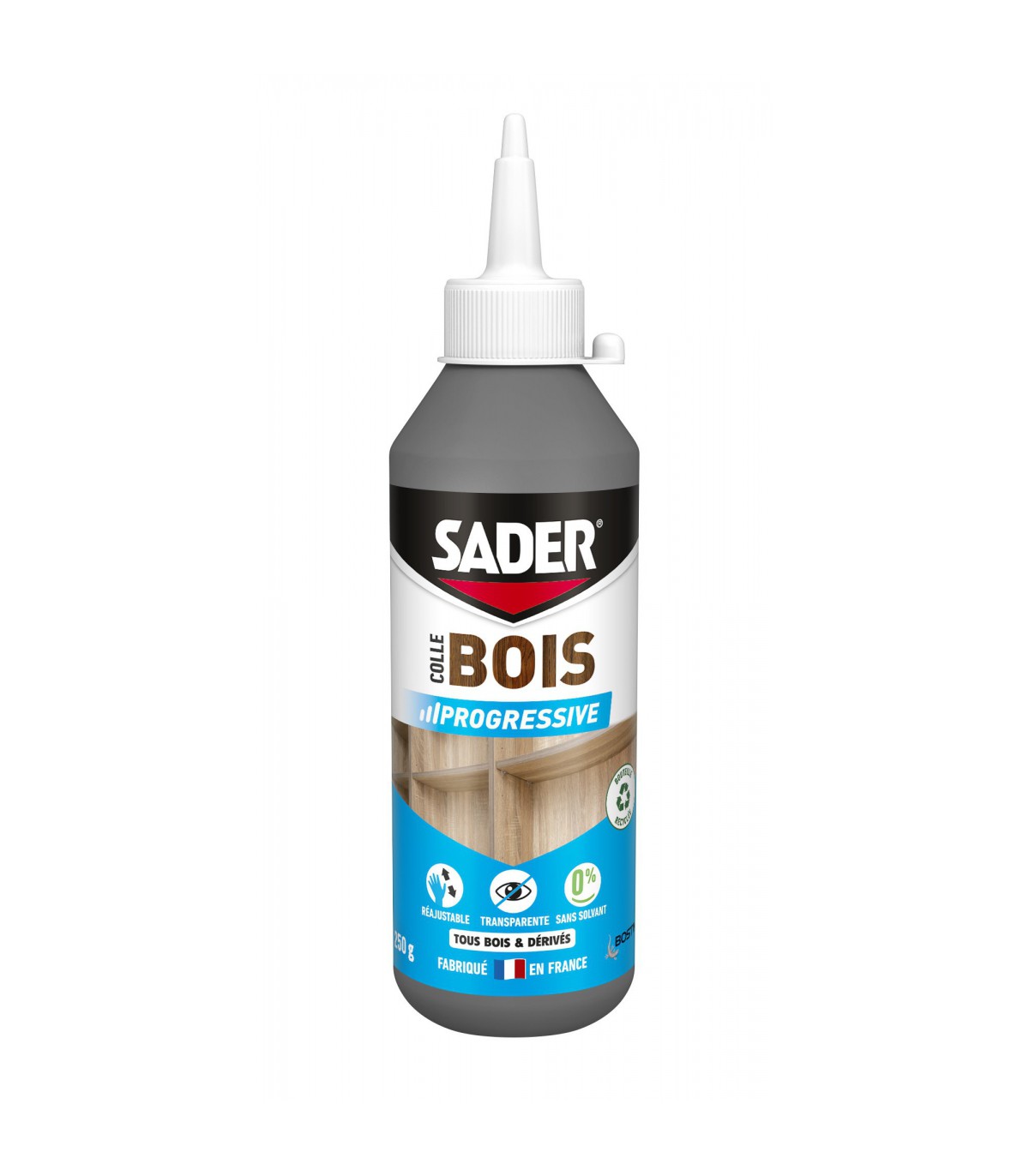 La colle bois prise progressive SADER est une colle vinylique blanche pour l'assemblage et le placage en intérieur de tous types de bois (toutes essences) et leurs dérivés : bois tendres, exotiques, contreplaqués, agglomérés, lamifiés, stratifiés..... Elle est spécialement recommandée pour les travaux de précision et de menuiserie. Convient également pour les petits collages : papier, carton, feutrine...