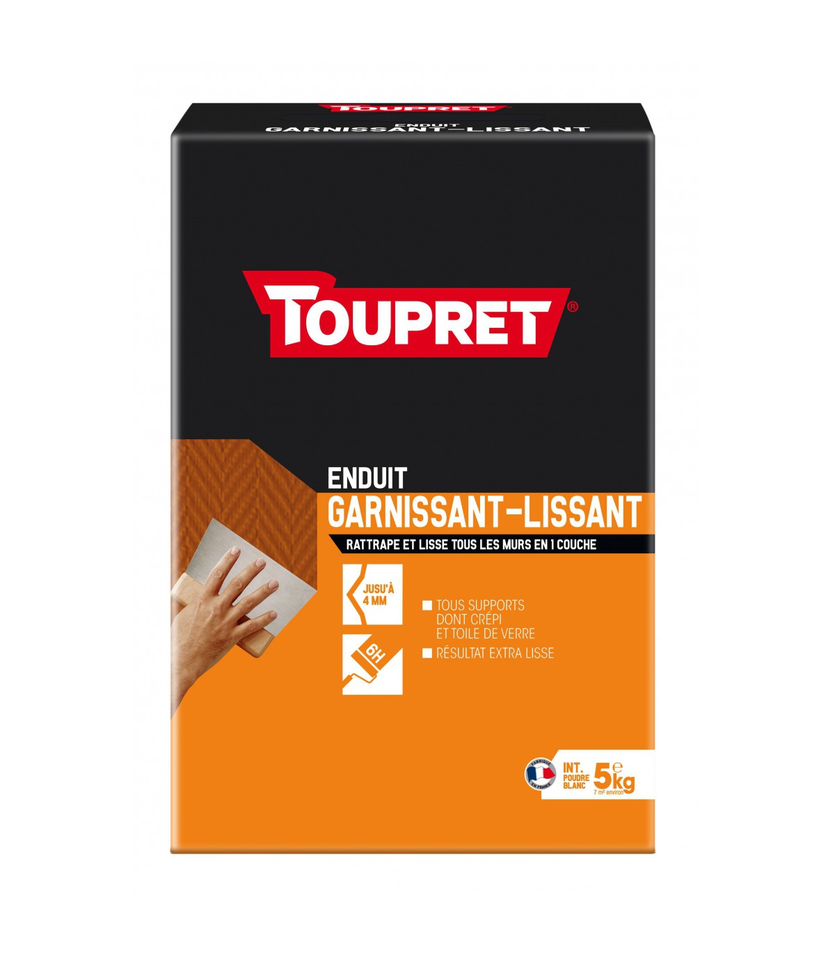 L'enduit garnissant-lissant Toupret est spécialement conçu pour lisser et égaliser tous types de murs à relief ou supports irréguliers. Sa formule en poudre permet une préparation facile et offre un grand confort d’application. Que ce soit pour la toile de verre, les crépis ou les murs anciens, il garantit une surface parfaitement plane en une seule application.