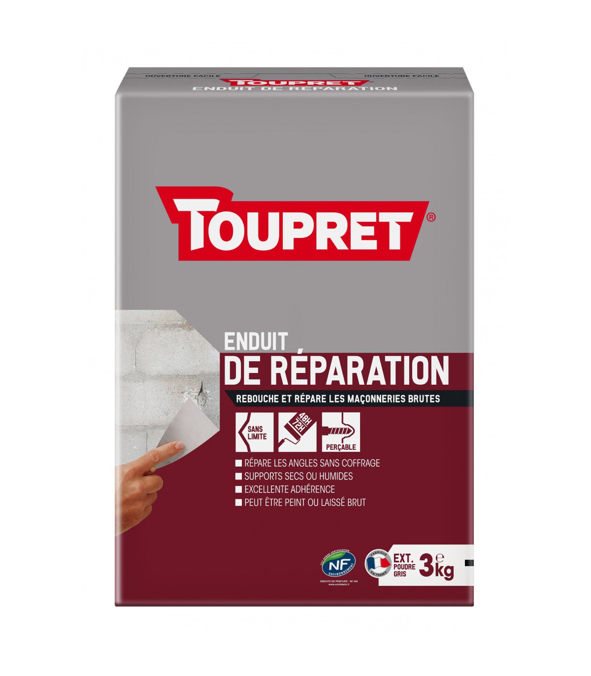 L'enduit Réparation est un enduit en poudre facile à préparer qui permet de réparer sans coffrage les maçonneries brutes (angles cassés, nez de marches, appuis de fenêtres) même humides en extérieur. L'enduit Réparation rebouche trous et fissures sans limite d'épaisseur et peut être peint.