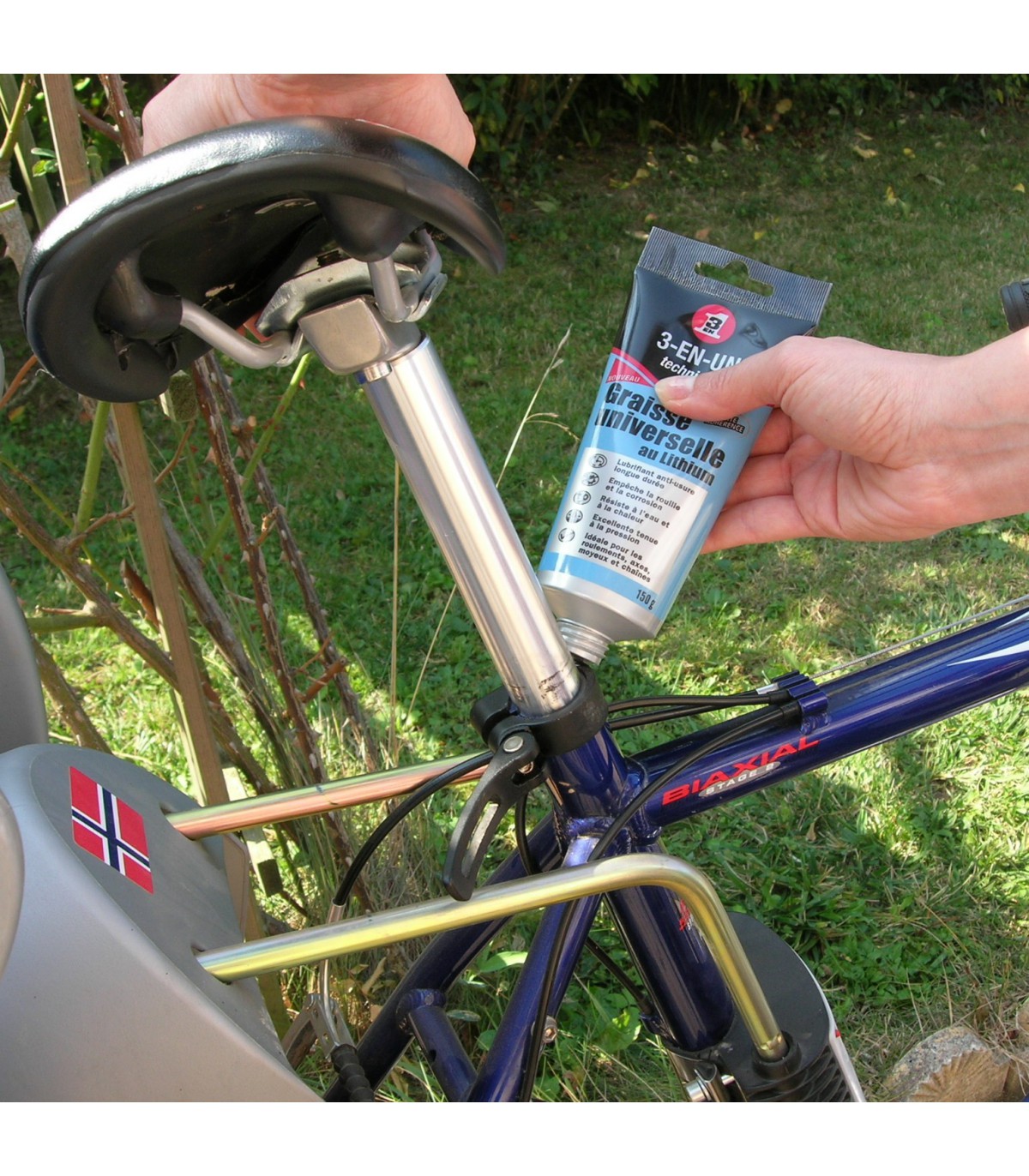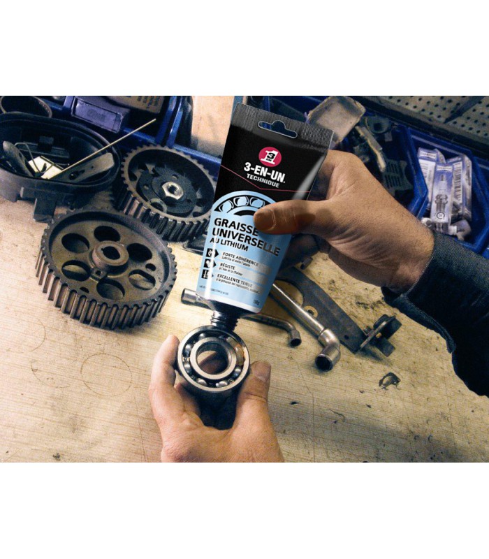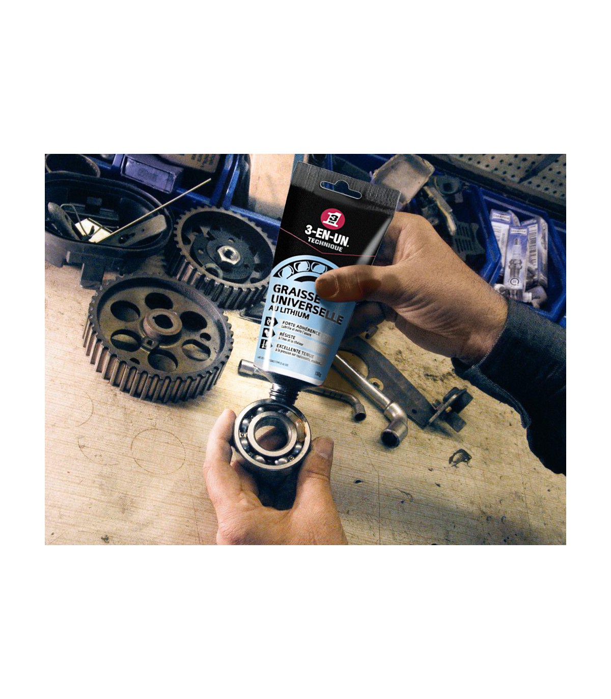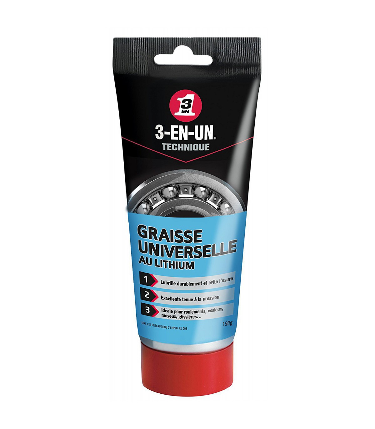 Graisse universelle au lithium en tube de marque 3-en-un. Permet d'assurer une lubrification longue durée de tous les mécanismes. Lubrifie tout les mécanismes qui roulent, tournent, glissent ou s'emboîtent. Adaptée aux conditions extérieures, elle résiste à l'eau et à la pression. Réduit les frottements tout en protégeant de la rouille et de la corrosion. Elle est indiquée pour les moyeux, paliers, galets, engrenages, charnières de portail, etc.