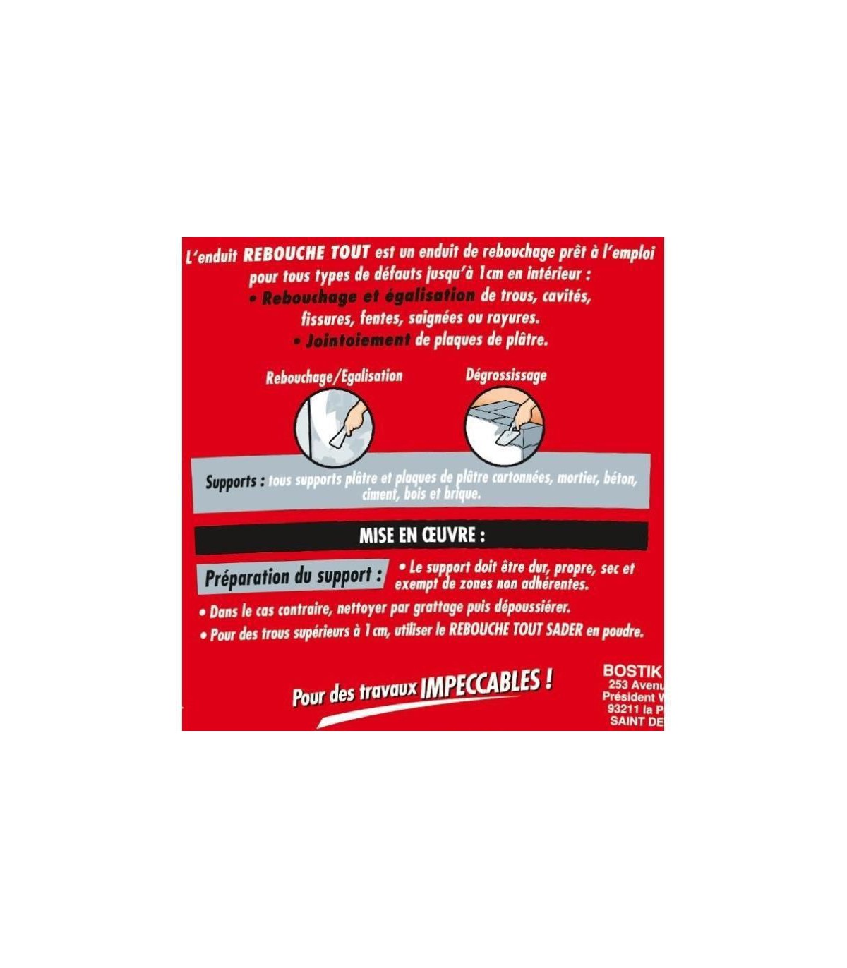 Enduit mural de rebouchage en pâte. Produit prêt à l'emploi permettant de reboucher les trous jusqu'à 1cm en intérieur. Rebouchage de trous, cavités, fissures, saignées et jointoiement de plaques de plâtre.