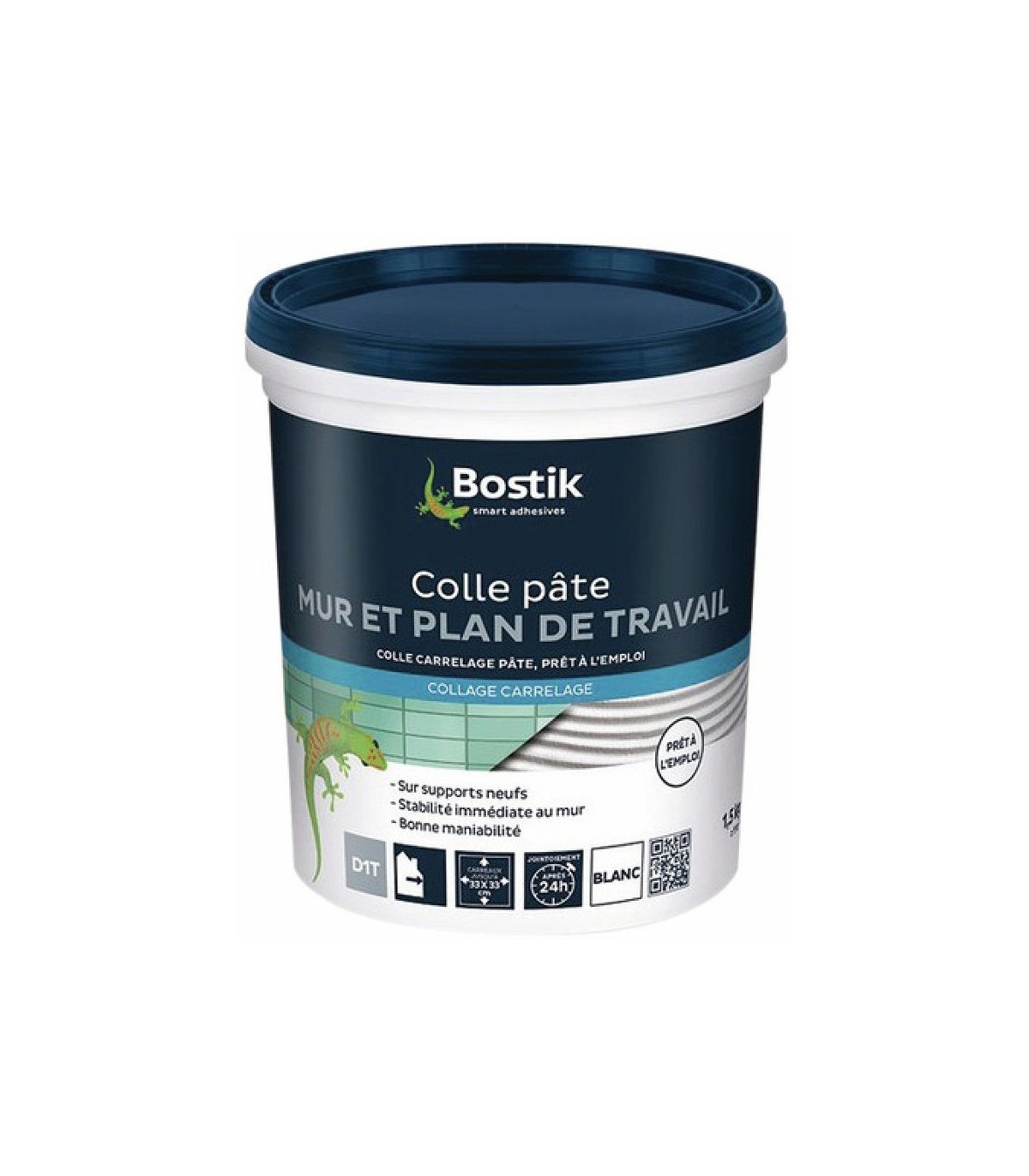 Colle carrelage Bostik en pâte pour une application sur mur et plan de travail. Produit prêt à l'emploi applicable sur support neuf. Stabilité immédiate au mur. Adapté pour des carreaux jusqu'à 33x33cm. Tous carrelages muraux : Faïence, marbre naturel, pâte de verre, pierre.
