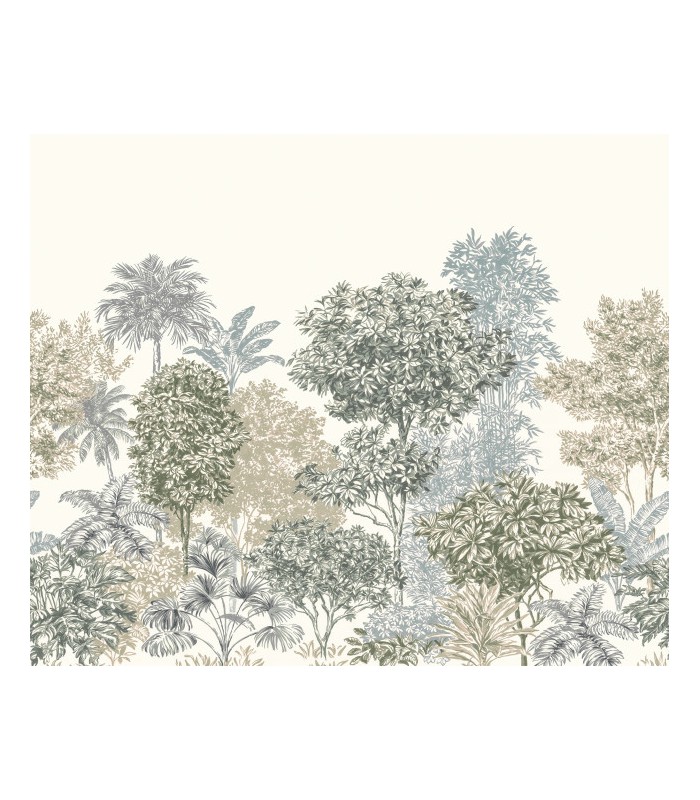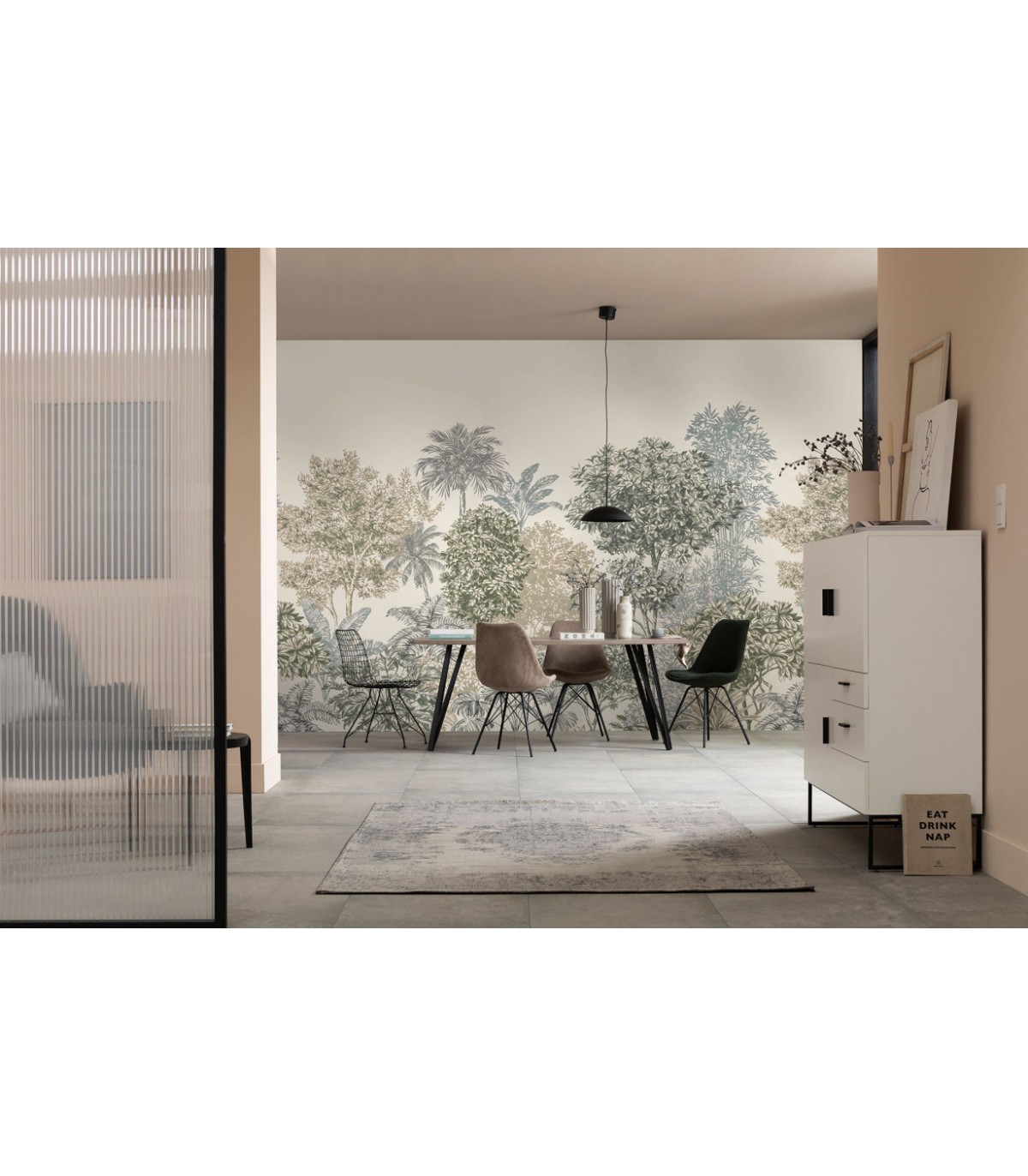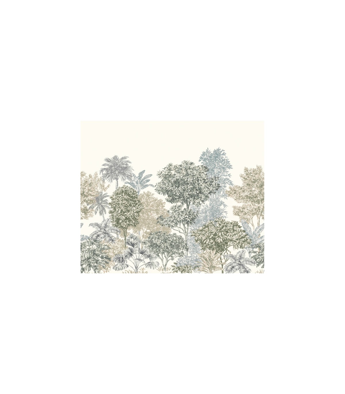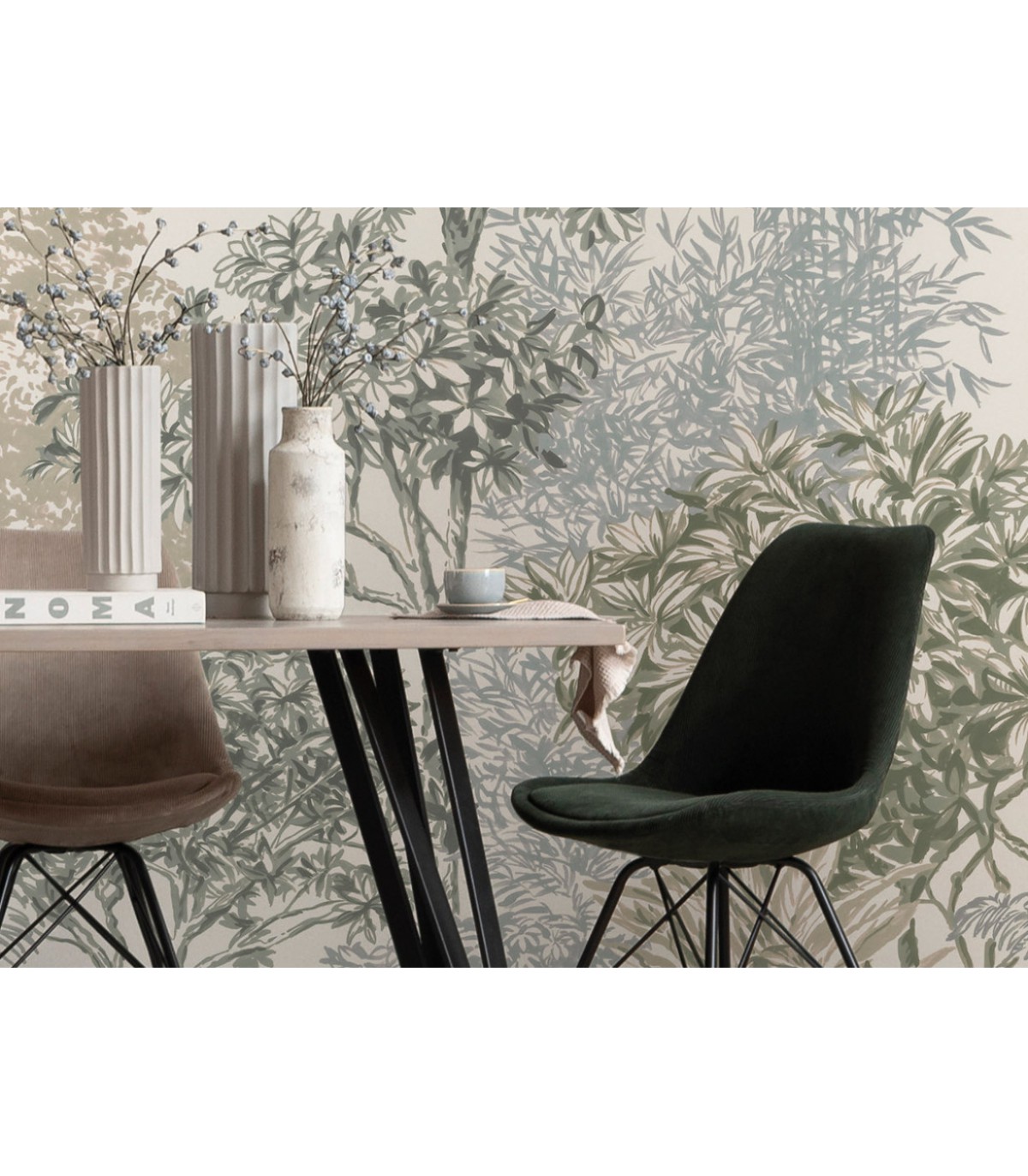 En dépit de ses couleurs discrètes, cette œuvre d'art tropicale attire immédiatement le regard. Ce papier peint crée une ambiance agréable et introduit la jungle dans la maison dans un style naturel.