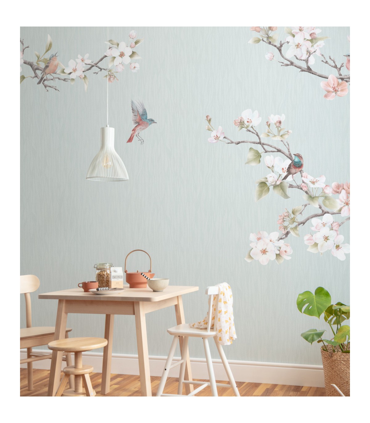 Les couleurs discrètes et les détails sobres confèrent à la maison une ambiance paisible. Les fleurs de cerisier ludiques et les petits oiseaux confèrent en outre à chaque pièce une ambiance romantique.