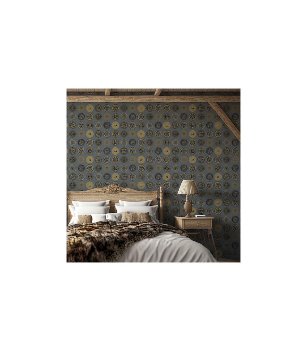 Présentées comme une répétition frappante de visages brillants, les palettes de couleurs de Soli vont d'un monochrome remarquablement simple à un riche vert émeraude avec des soleils dorés rayonnants. Ici présenté dans sa version Midnight & Soft Gold