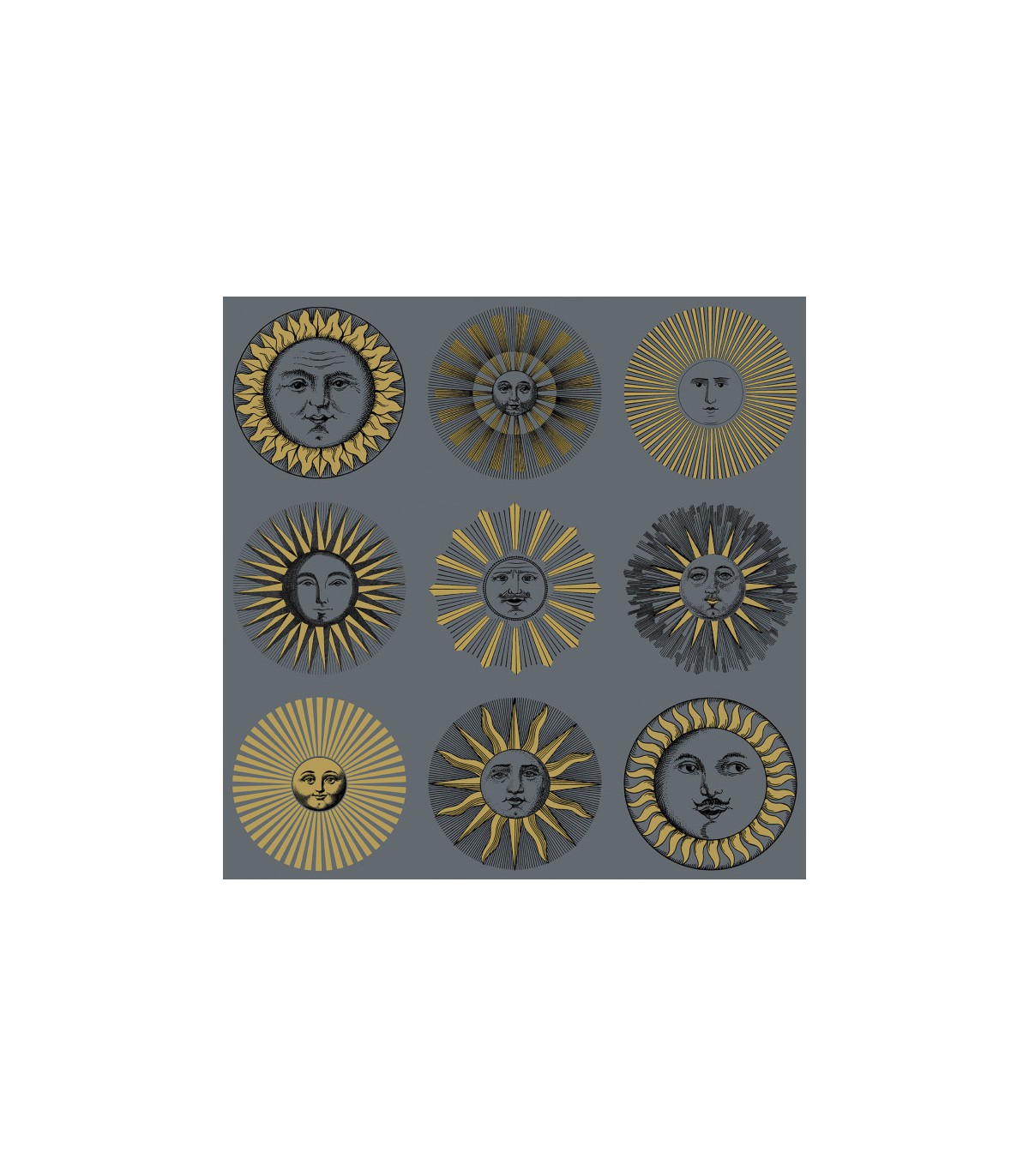 Classique du portfolio de l'Atelier, le soleil occupe une place privilégiée dans le répertoire des formes naturelles de Fornasetti et constitue l'un des motifs majeurs de l'univers visuel de l'Atelier. Une prédilection en partie justifiée par le fait que pendant des années, au début des années 1940, à la demande de Gio Ponti, Piero Fornasetti a conçu des almanachs sur le thème de la lune, destinés à être offerts comme cadeaux de Noël.