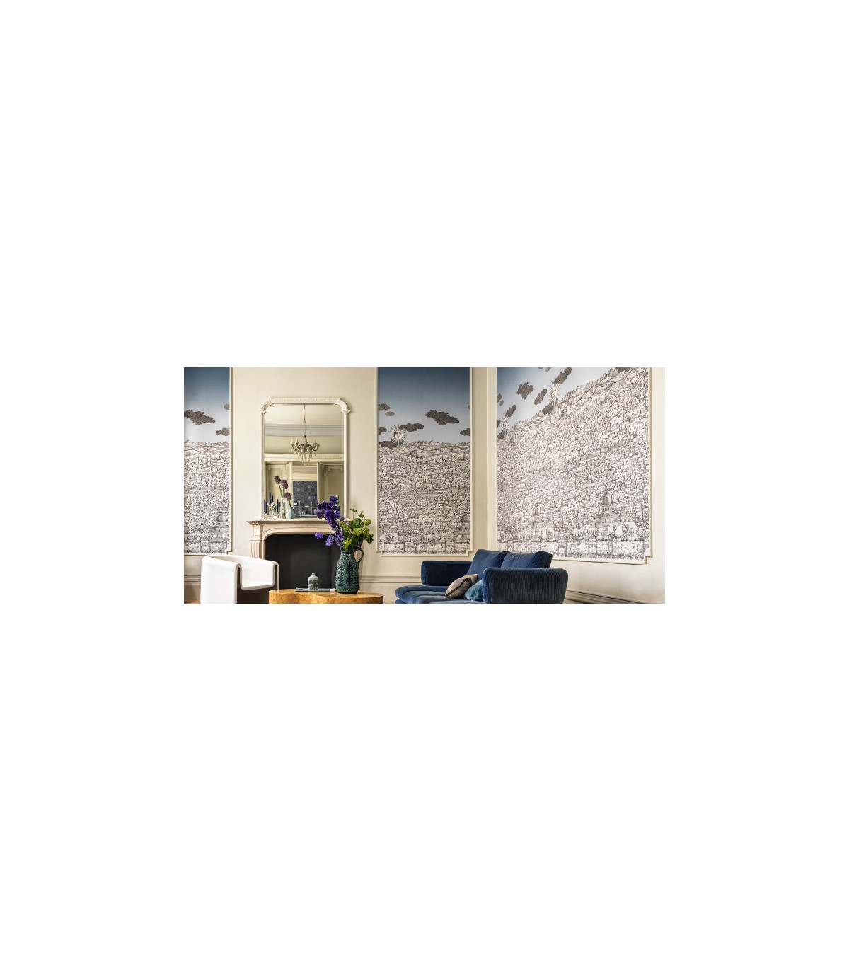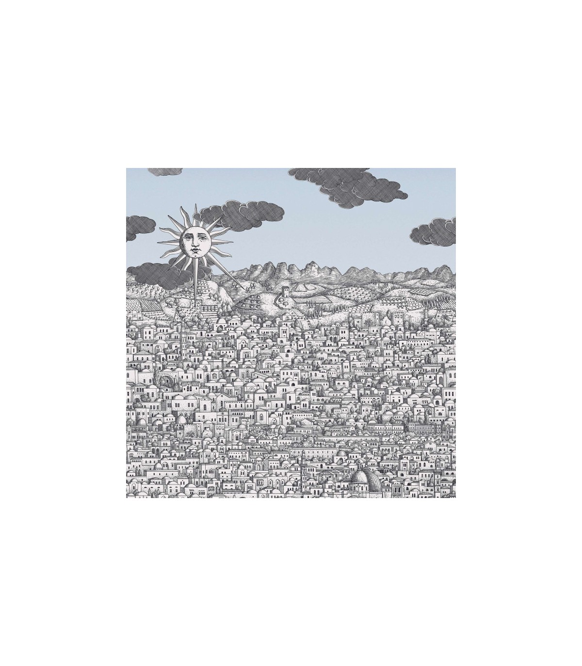 Un vol au-delà des limites de l'imagination conduit Fornasetti à une Jérusalem enchantée et hypnotique. De multiples points de vue se superposent, différents styles architecturaux se succédant dans un motif continu. La ligne noire précise des bâtiments interprète une imagination sans limites, créant une texture intrigante. Le premier voyage onirique de ce motif a eu lieu sur le papier peint ""Gerusalemme"" conçu par Piero Fornasetti pour le hall d'entrée de sa résidence milanaise à la fin des années 1940.