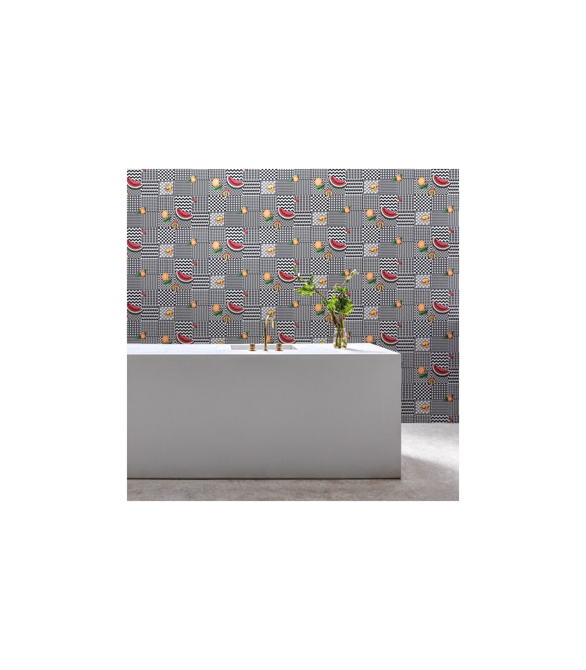 Le papier peint Frutta e Geometrico, issu de la collection Fornasetti Senza Tempo II signée Cole & Son, mêle avec audace la rigueur architecturale et la fantaisie poétique. Inspiré des esquisses de Piero Fornasetti, il juxtapose un quadrillage géométrique précis et des motifs de fruits délicatement dessinés, symboles de nature et d’abondance. Ce jeu visuel entre ordre et imagination crée une composition à la fois graphique, ludique et sophistiquée - une véritable œuvre murale pour sublimer les intérieurs contemporains comme classiques.
