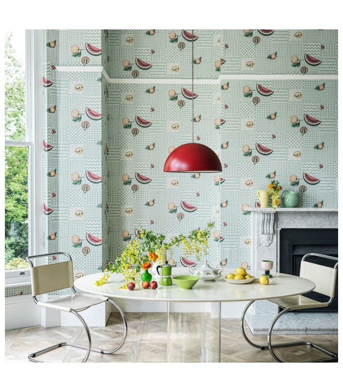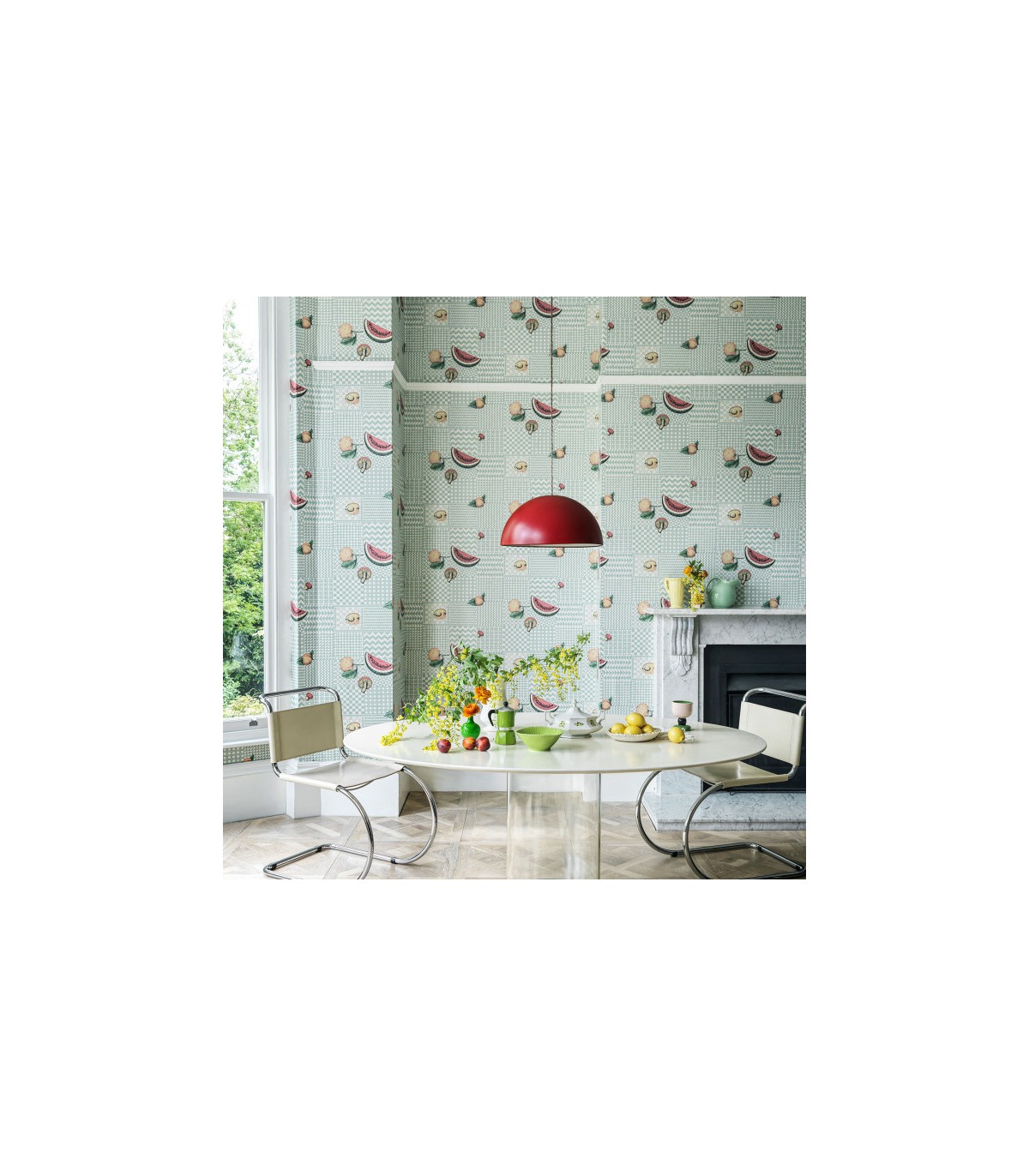 Le papier peint Frutta e Geometrico, issu de la collection Fornasetti Senza Tempo II signée Cole & Son, mêle avec audace la rigueur architecturale et la fantaisie poétique. Inspiré des esquisses de Piero Fornasetti, il juxtapose un quadrillage géométrique précis et des motifs de fruits délicatement dessinés, symboles de nature et d’abondance. Ce jeu visuel entre ordre et imagination crée une composition à la fois graphique, ludique et sophistiquée - une véritable œuvre murale pour sublimer les intérieurs contemporains comme classiques.