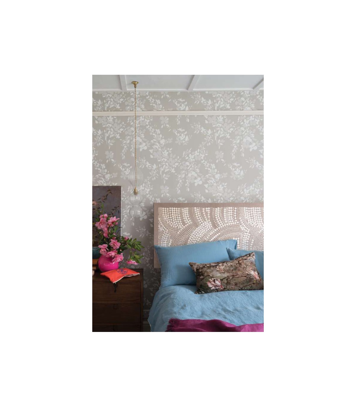 "Moins strict qu’un motif fleuri classique, Hegemone tire sa singularité de ses pétales de couleurs se déployant de façon aléatoire et semblant comme découpés dans du papier. Tenant son nom de la déesse grecque des fruits et des fleurs, ce motif s’épanouit avec grâce sur les murs de la maison, y imprimant sa joie de vivre et son dynamisme naturel.