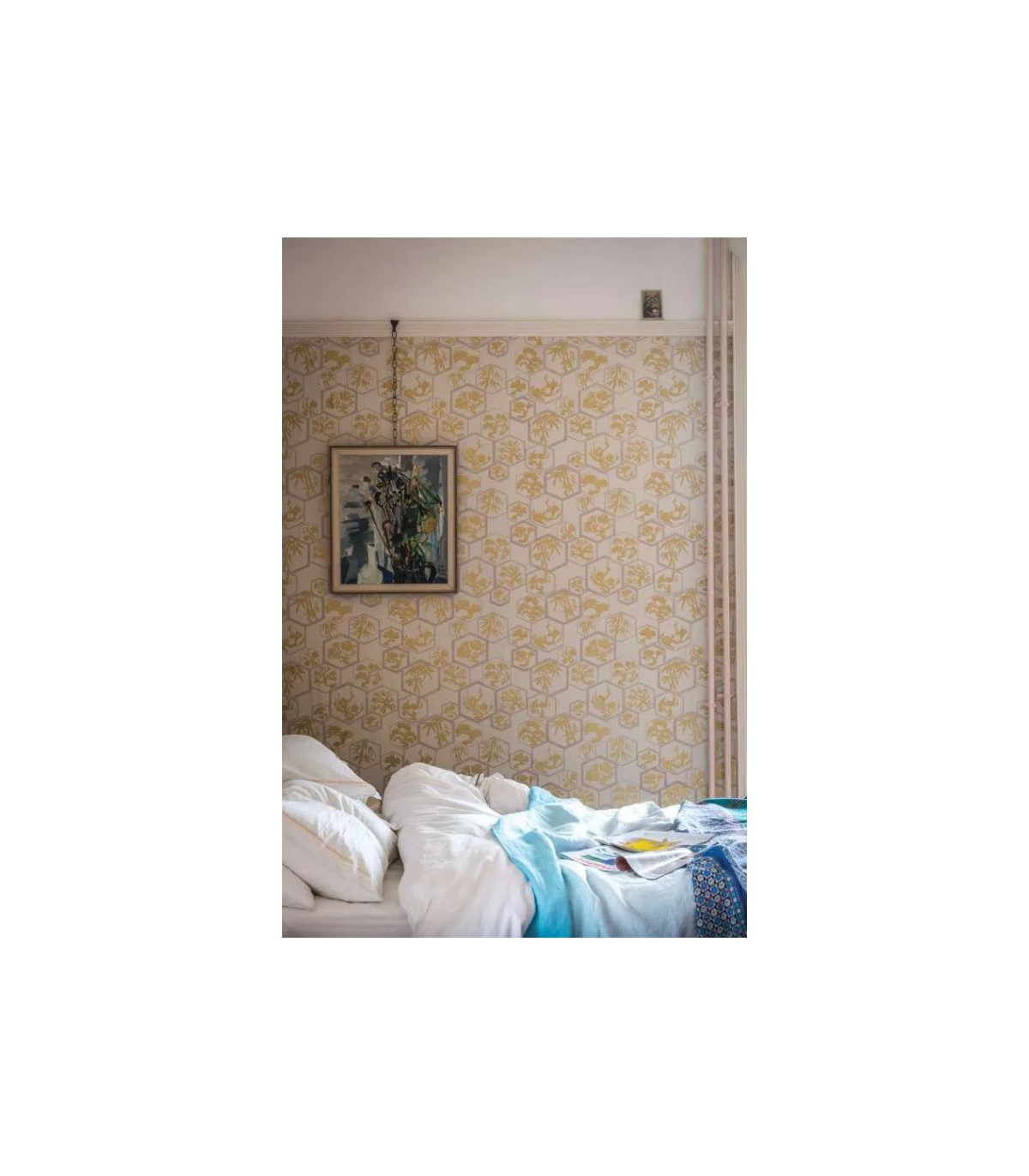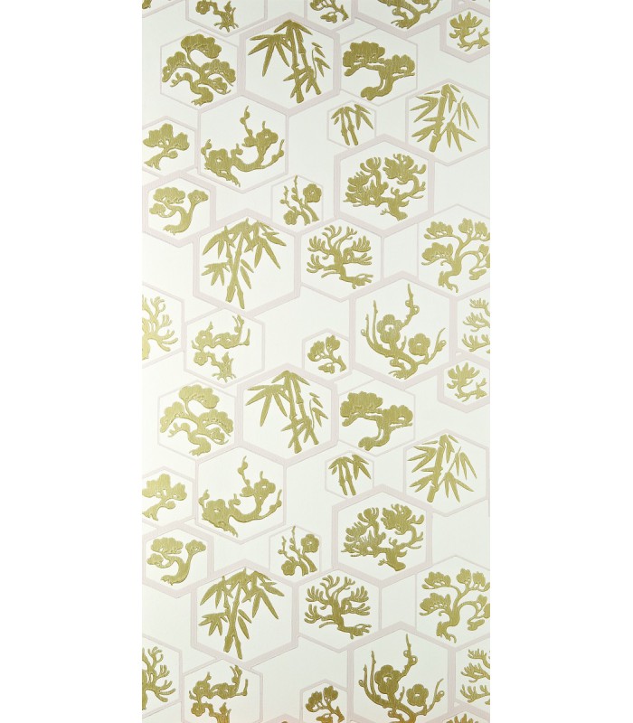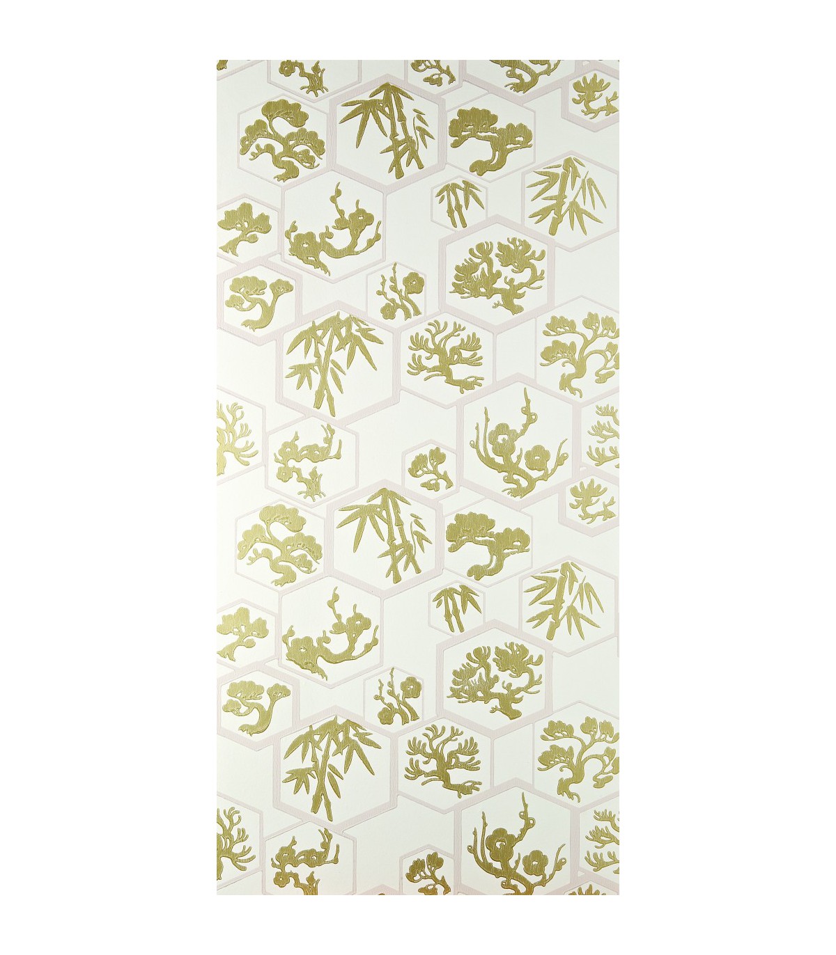 "Terme japonais sans équivalent, Shouchikubai désigne les trois amis de l’hiver que sont la prune, le pin et le bambou, qui ont pour point commun de résister aux mois les plus froids, ce qui en fait, en Extrême-Orient, des symboles de force, de beauté et de longévité. Dans leurs cadres hexagonaux, ces motifs végétaux, insufflent grâce et élégance dans le décor, quel que soit l’espace qu’ils habillent.