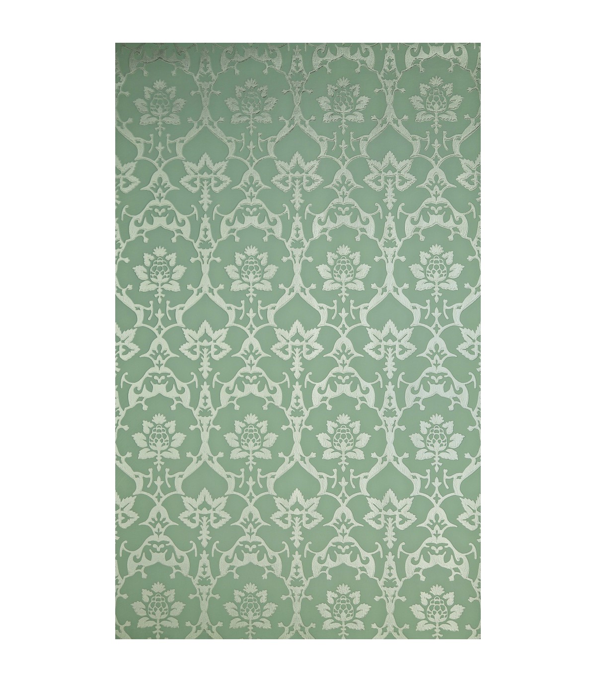 "Appartenant à notre série de papiers peints damassés, le motif Brocade s’inspire des somptueux tissus que l’on peut admirer sur les peintures de la Renaissance exposées à la National Gallery. Orné de chardons, de fleurs et de feuilles, le papier peint pose un décor élégamment ordonné dans les intérieurs traditionnels comme contemporains.