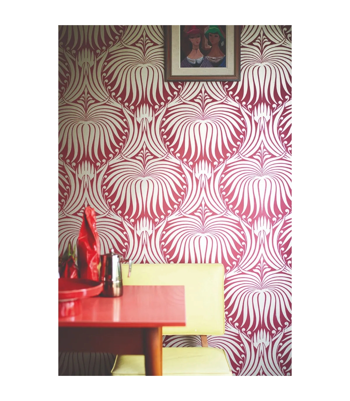 "Inspiré de la période Belle Époque, le motif Lotus apporte une touche vintage élégante typique du XIXème siècle dans les maisons traditionnelles comme contemporaines. Les fleurs qui s’épanouissent au mur sont imprimées directement à partir de peinture Farrow & Ball, ce qui donne cet effet texturé au papier et cette dynamique au motif.