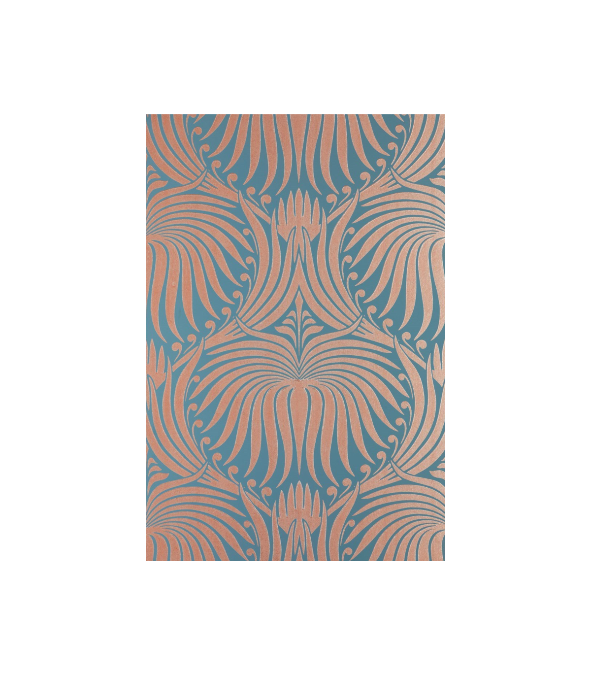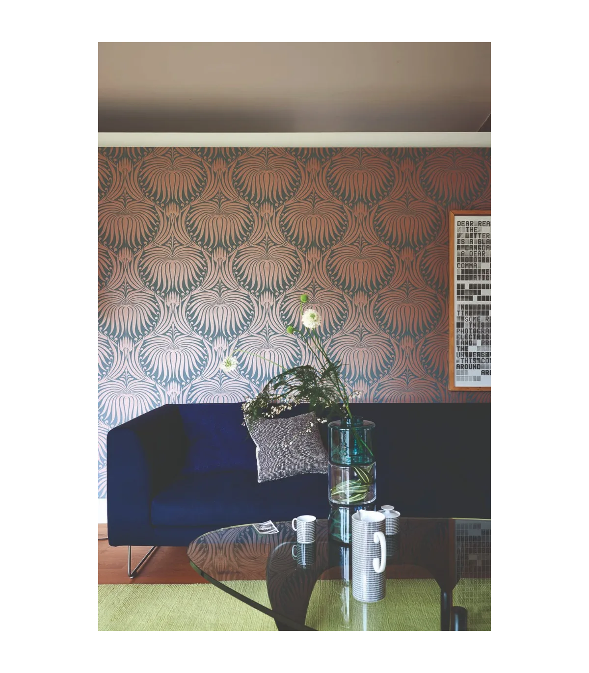 "Inspiré de la période Belle Époque, le motif Lotus apporte une touche vintage élégante typique du XIXème siècle dans les maisons traditionnelles comme contemporaines. Les fleurs qui s’épanouissent au mur sont imprimées directement à partir de peinture Farrow & Ball, ce qui donne cet effet texturé au papier et cette dynamique au motif.