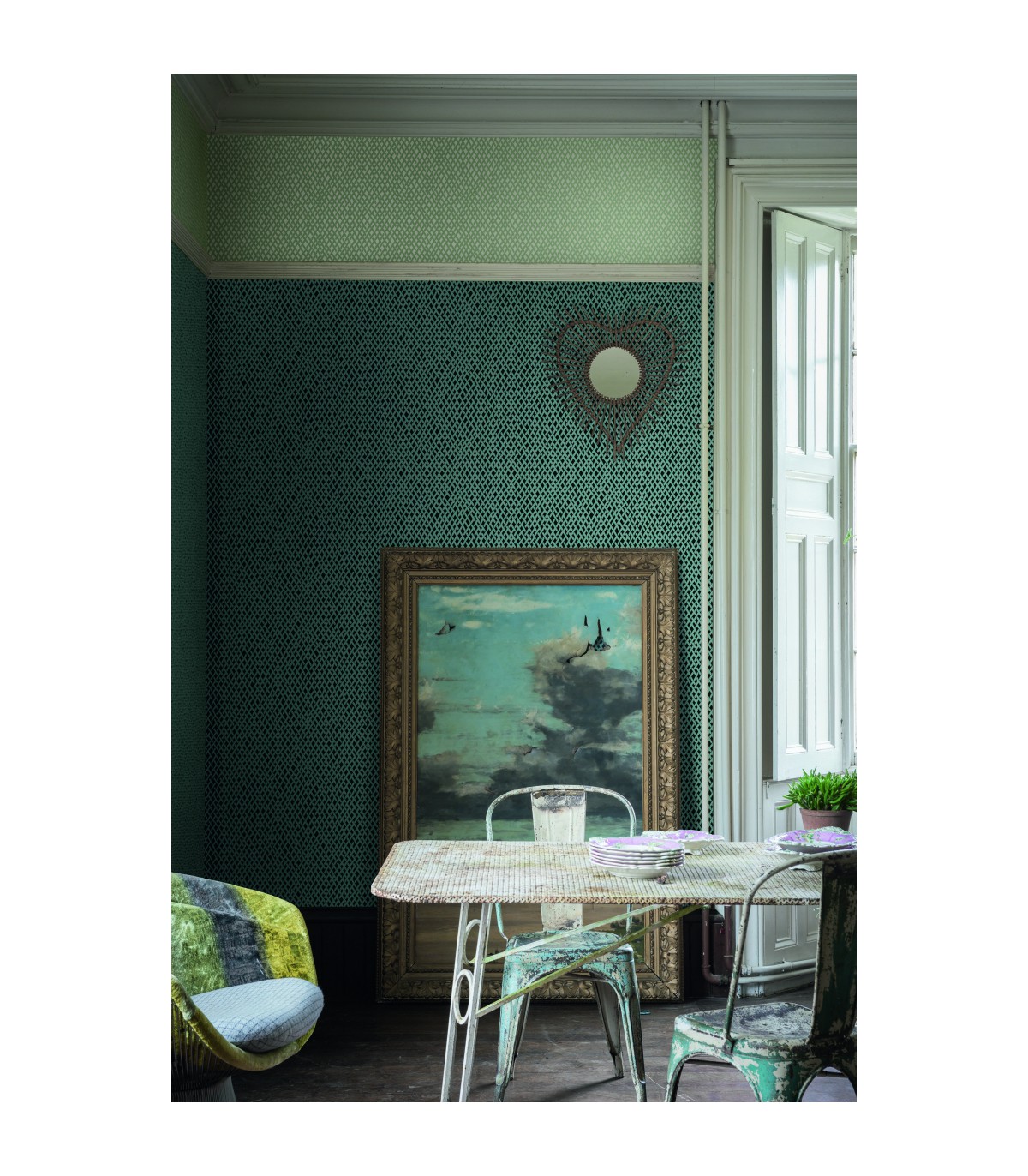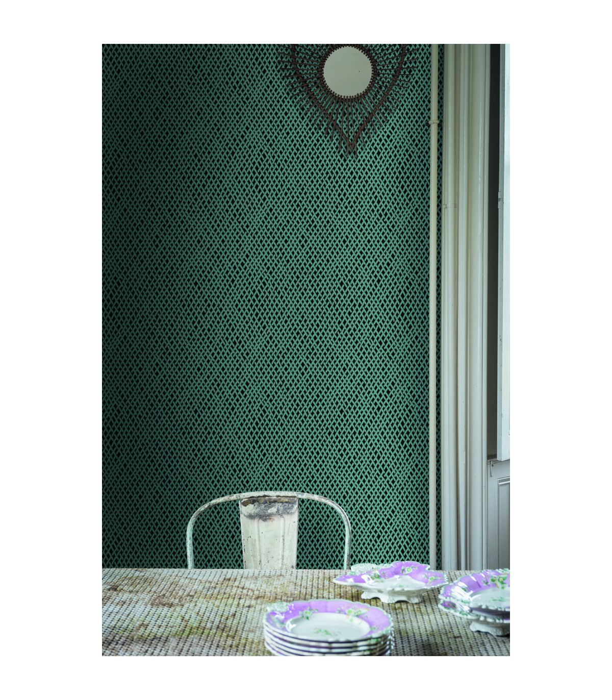 "Le tissage représenté sur ce papier peint est sublimé par notre méthode d’impression qui crée un effet tactile unique et donne au motif une profondeur exceptionnelle. Amime est un terme japonais désignant l’espace entre les maillages, le motif renvoie ainsi à des scènes de pêche côtière authentiques et paisibles. Son aspect narratif habille chaleureusement les murs, quelle que soit la pièce.