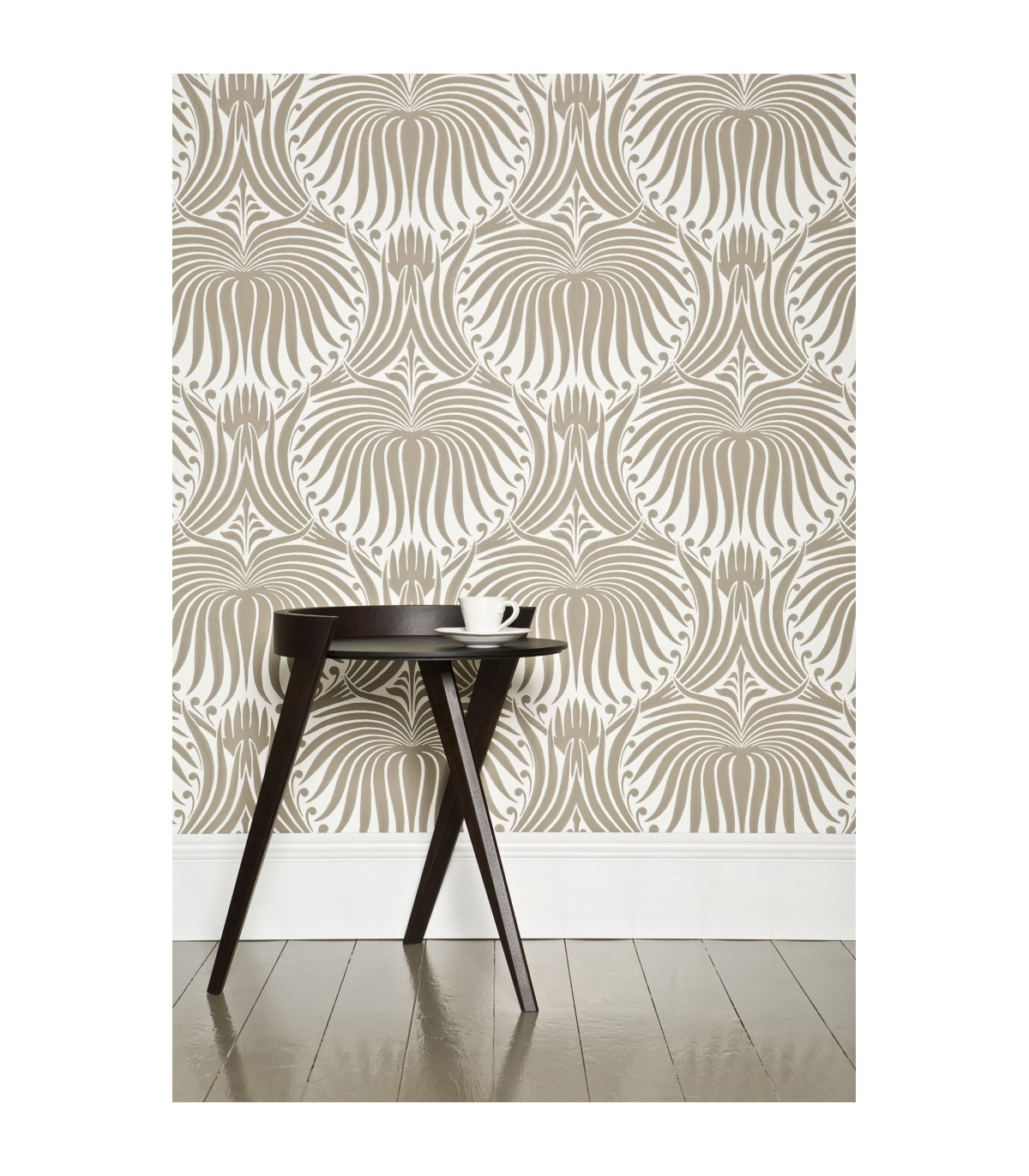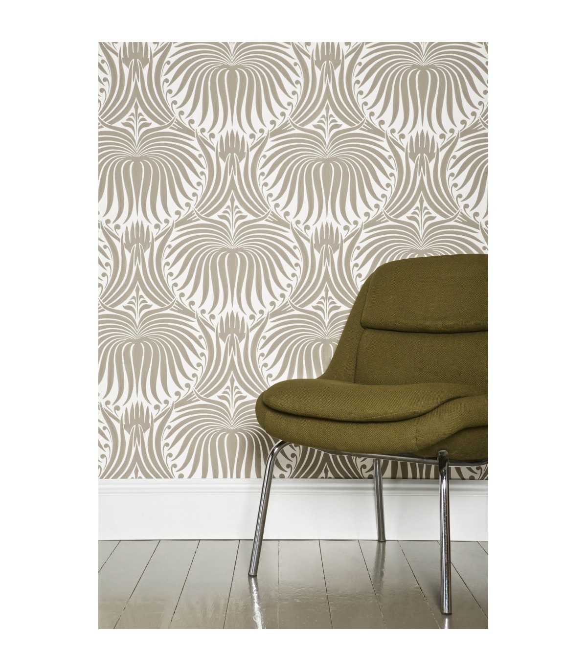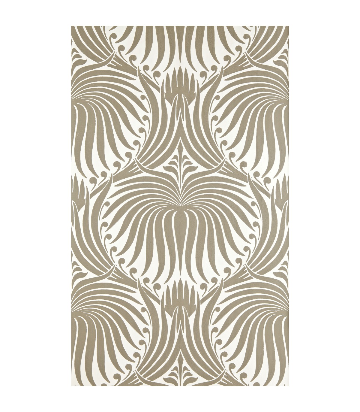 "Inspiré de la période Belle Époque, le motif Lotus apporte une touche vintage élégante typique du XIXème siècle dans les maisons traditionnelles comme contemporaines. Les fleurs qui s’épanouissent au mur sont imprimées directement à partir de peinture Farrow & Ball, ce qui donne cet effet texturé au papier et cette dynamique au motif.