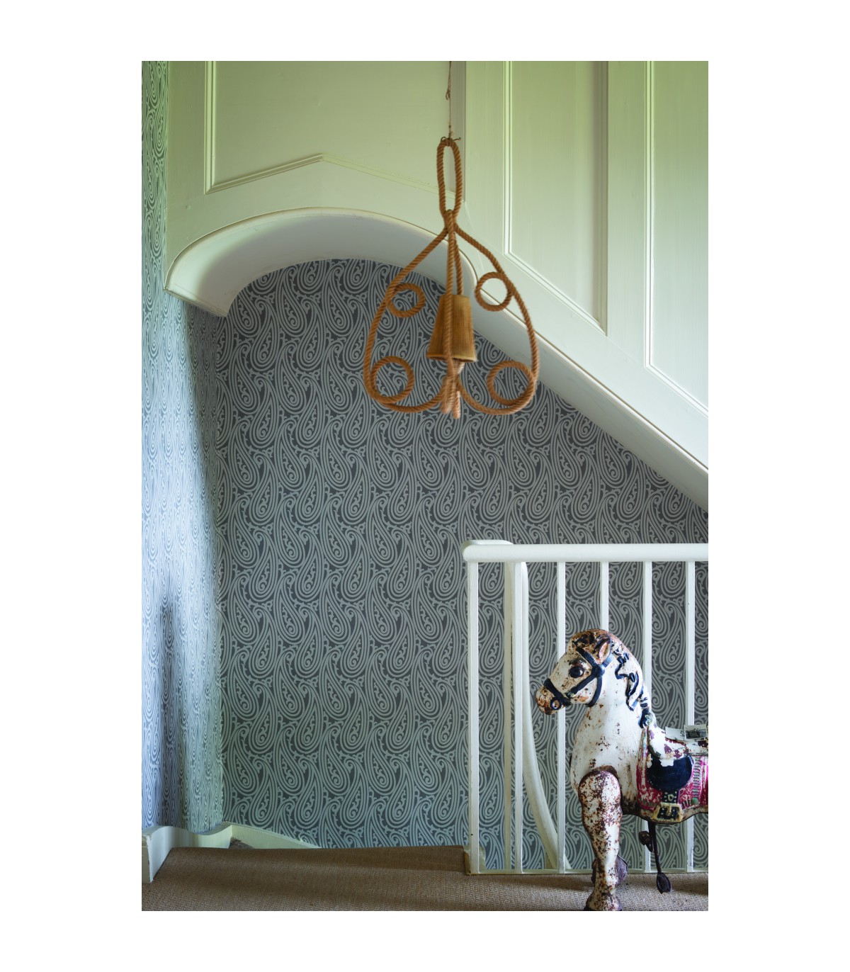 "Les lignes pures et les courbes hypnotiques de ce modèle de papier peint très prisé reproduisent le motif d’un tissu français du XIXème siècle. Originaire de Perse, et adopté en Occident par le biais des tisserands écossais, le motif Paisley –ou Cachemire– a un caractère vraiment international. Contemporain, il est aussi résolument intemporel.