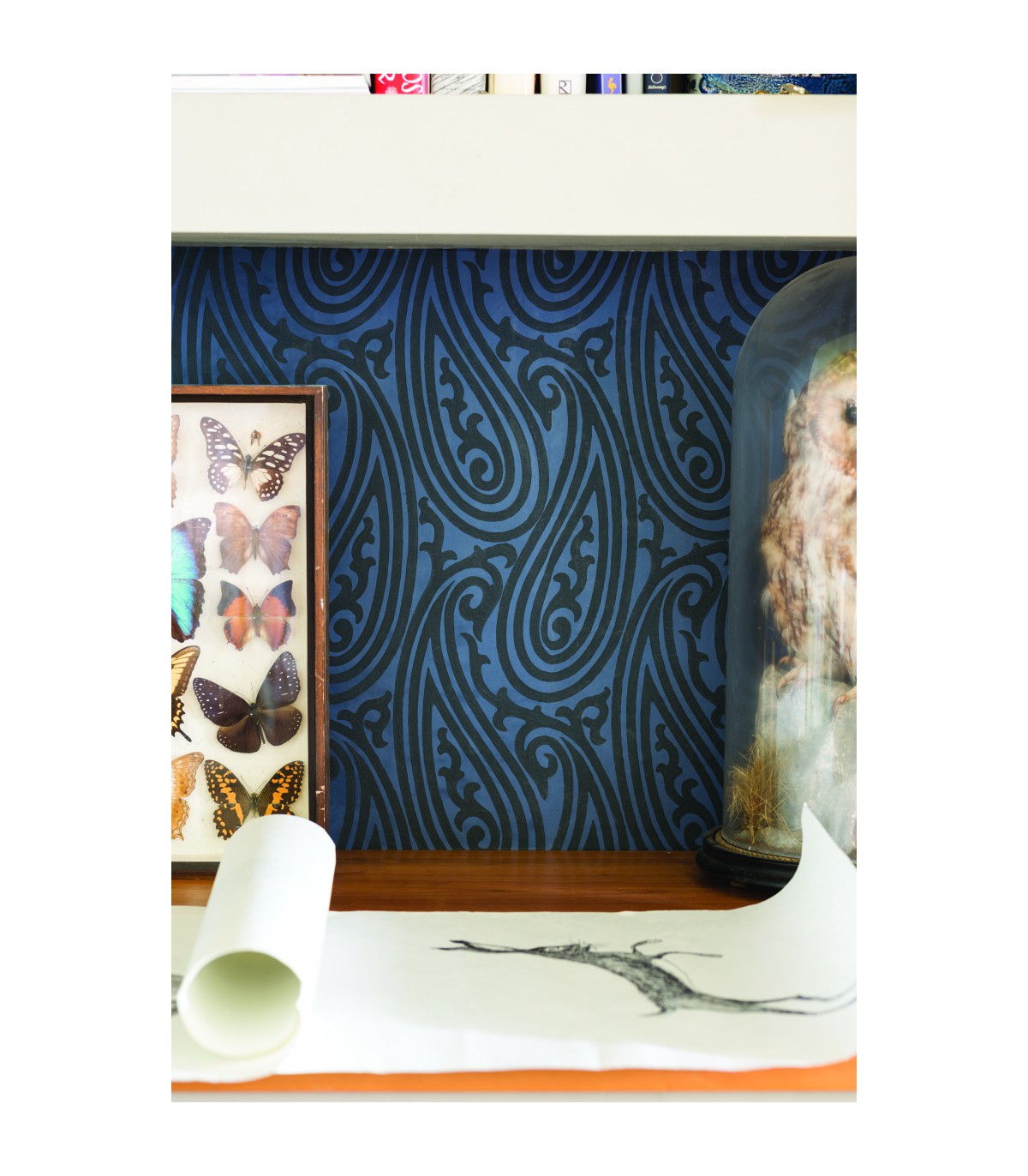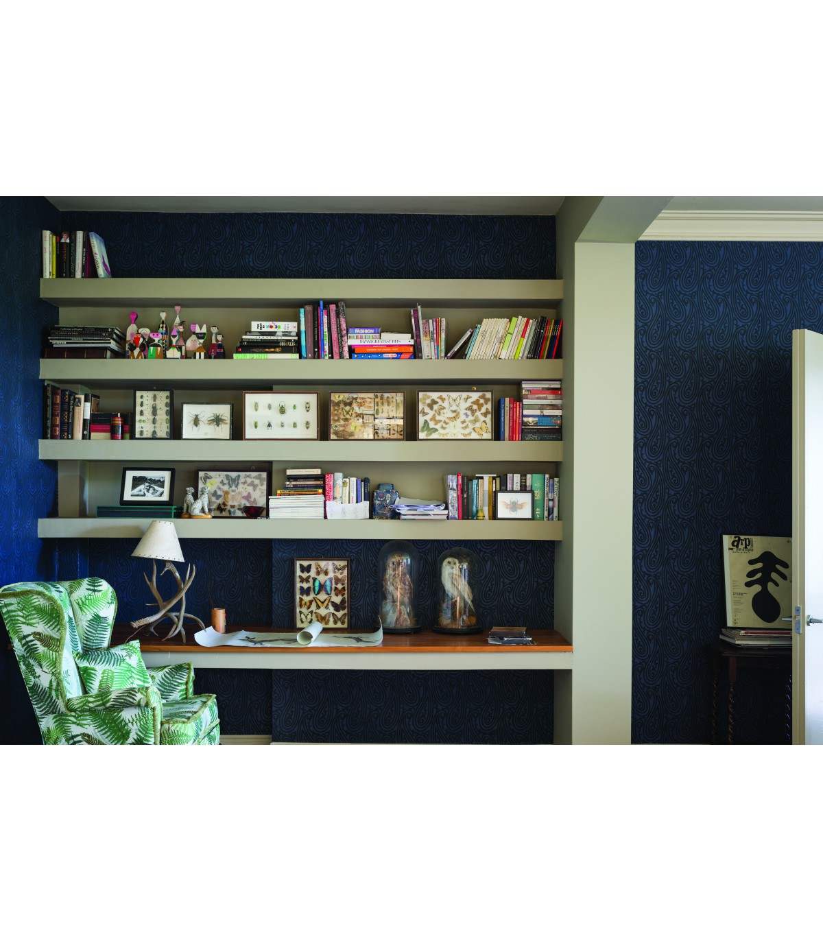 "Les lignes pures et les courbes hypnotiques de ce modèle de papier peint très prisé reproduisent le motif d’un tissu français du XIXème siècle. Originaire de Perse, et adopté en Occident par le biais des tisserands écossais, le motif Paisley –ou Cachemire– a un caractère vraiment international. Contemporain, il est aussi résolument intemporel.