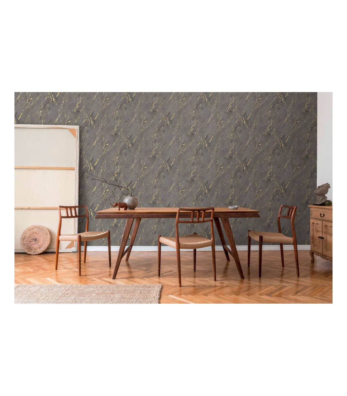 Rouleau 0,53x10,05 m, Raccord sauté de 64/32 cm. Couleur: doré, métallique, noir. Décor: déco / motif, moderne, pierre, structure. Pièce: bureau, chambre, couloir, cuisine, salon. Qualité: Bonne résistance, Brossable, Strippable.