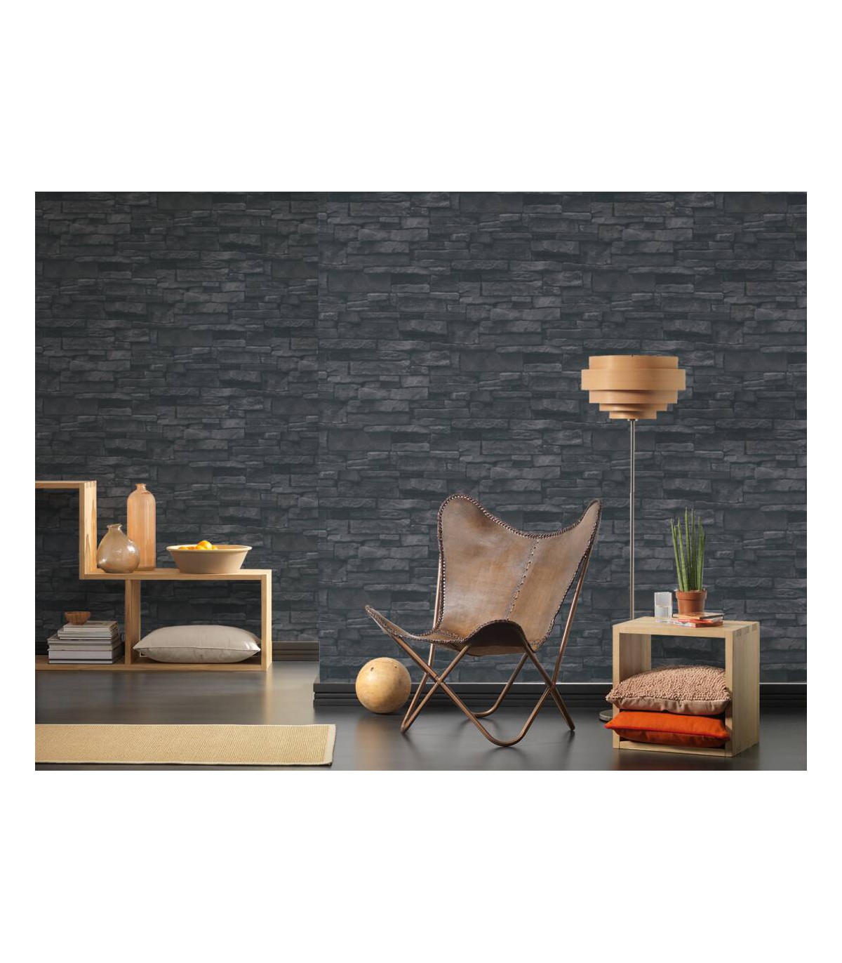 Rouleau 0,53x10,05 m, Raccord sauté de 64/32 cm. Couleur: noir. Décor: déco / motif, pierre, structure. Pièce: bureau, chambre, couloir, cuisine, salon. Qualité: Bonne résistance, Brossable, Strippable.