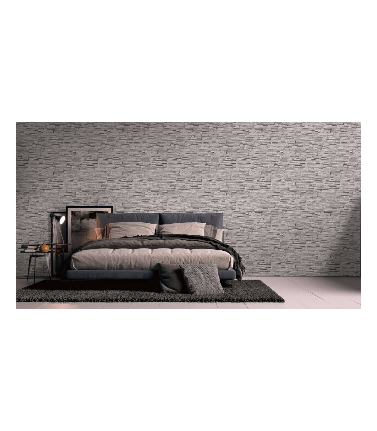 Rouleau 0,53x10,05 m, Raccord sauté de 64/32 cm. Couleur: crème, gris, noir. Décor: déco / motif, pierre. Pièce: chambre, couloir, cuisine, salon. Qualité: Bonne résistance, Brossable, Strippable.