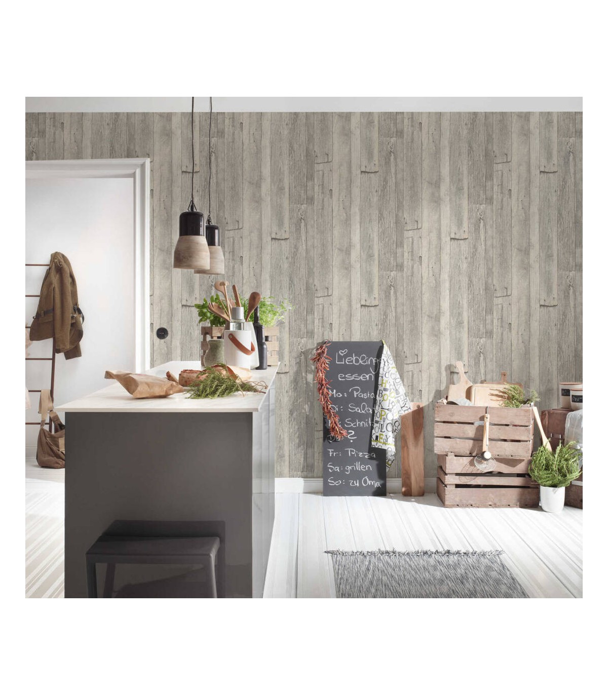 Rouleau 0,53x10,05 m, Raccord sauté de 64/32 cm. Couleur: beige, crème, gris. Décor: bois, maison, moderne. Pièce: chambre, couloir, cuisine, salle de bains, salon. Qualité: Bonne résistance, Brossable, Strippable.