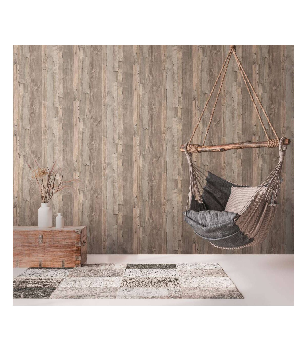 Rouleau 0,53x10,05 m, Raccord sauté de 64/32 cm. Couleur: beige, marron. Décor: bois, maison. Pièce: chambre, couloir, salon. Qualité: Bonne résistance, Brossable, Strippable.