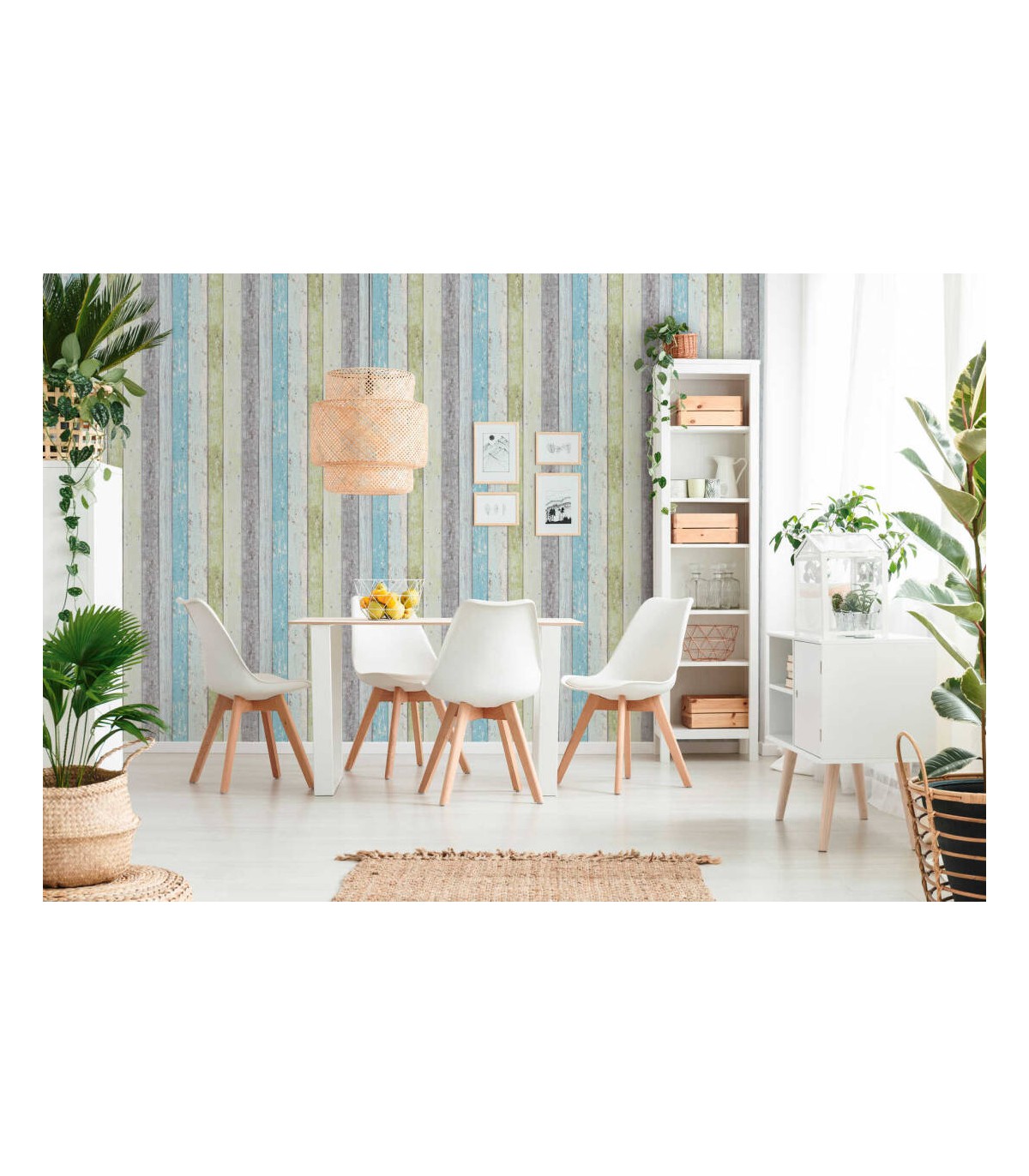 Rouleau 0,53x10,05 m, Raccord libre. Couleur: blanc, bleu, vert. Décor: bois, déco / motif, maison, moderne, rayures, structure. Pièce: chambre, chambre enfant, couloir, cuisine, salon. Qualité: Bonne résistance, Brossable, Strippable.