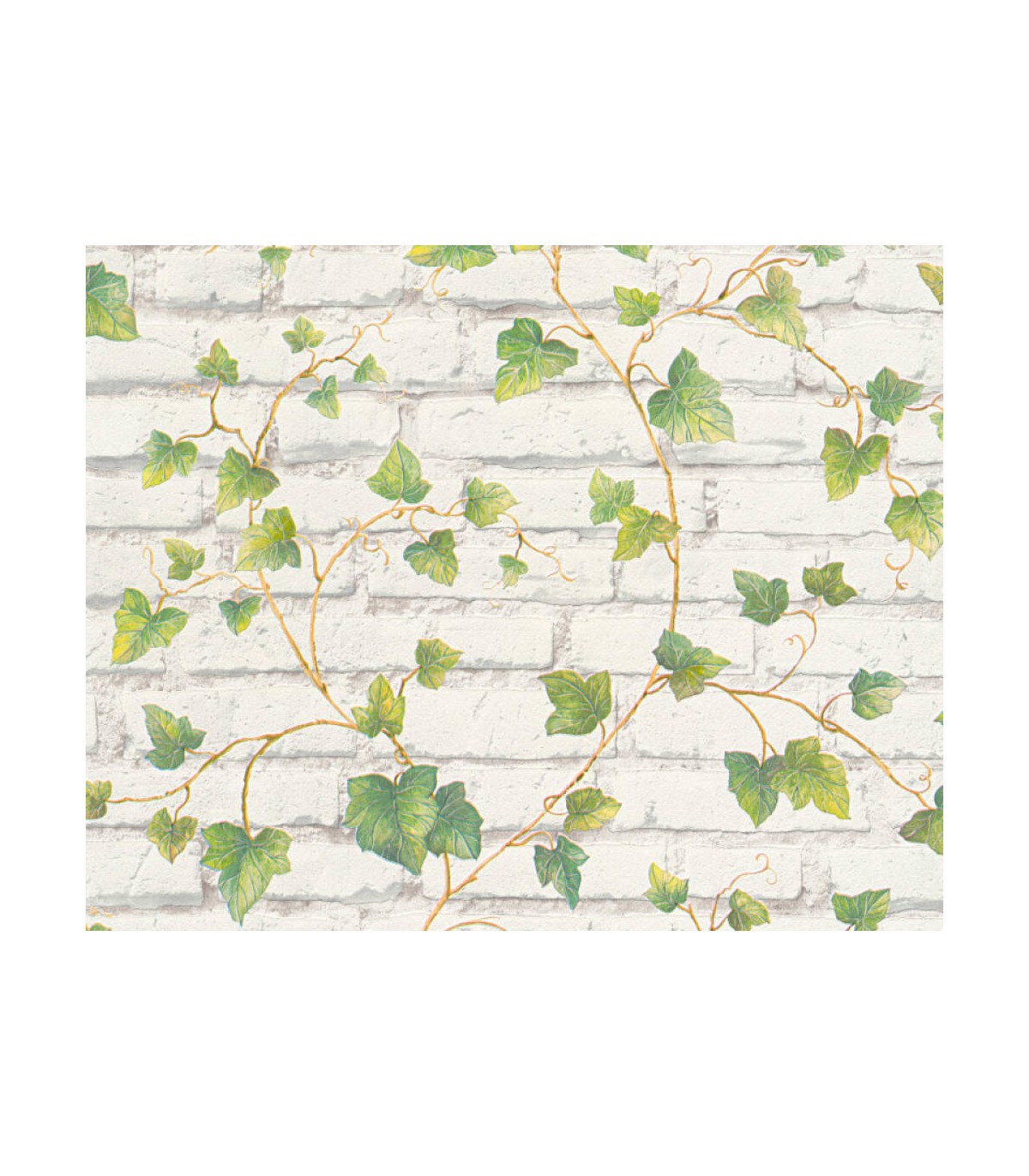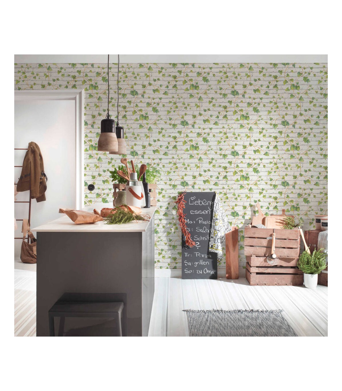 Rouleau 0,53x10,05 m, Raccord sauté de 64/32 cm. Couleur: blanc, marron, vert. Décor: déco / motif, pierre. Pièce: couloir, cuisine. Qualité: Bonne résistance, Lessivable, Strippable.