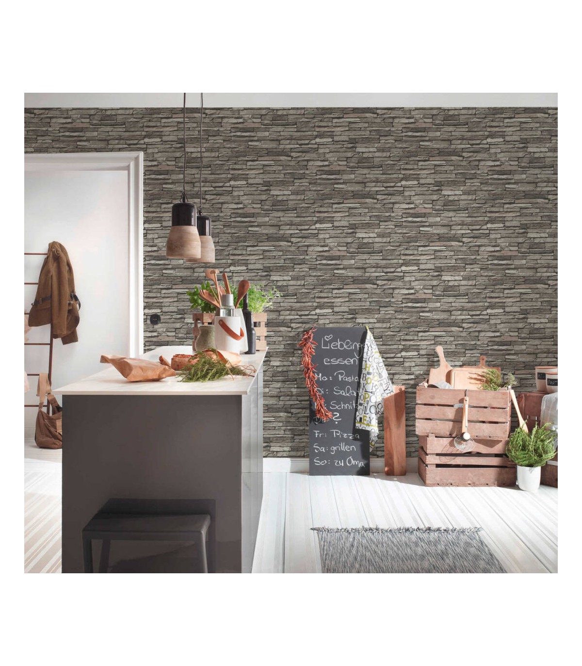Rouleau 0,53x10,05 m, Raccord sauté de 64/32 cm. Couleur: crème, gris, noir. Décor: maison, moderne, pierre, structure. Pièce: bureau, chambre, cuisine, salle de bains, salon. Qualité: Bonne résistance, Brossable, Strippable.