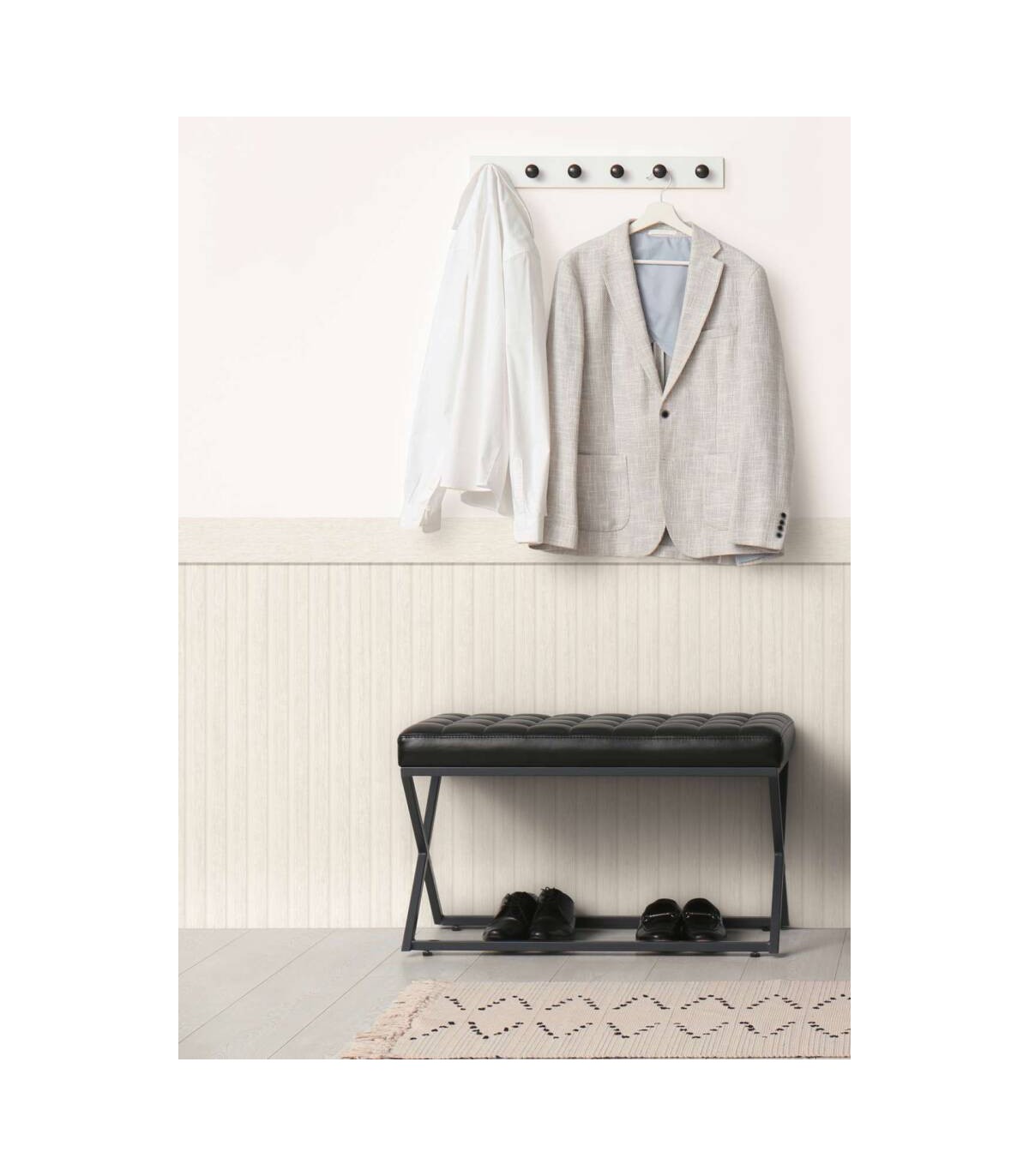 Rouleau 1,06x5,00 m, Raccord libre. Couleur: blanc, gris. Décor: bois, déco / motif, rayures. Pièce: chambre, couloir, cuisine, salle de bains, salon. Qualité: Bonne résistance, Brossable, Strippable.