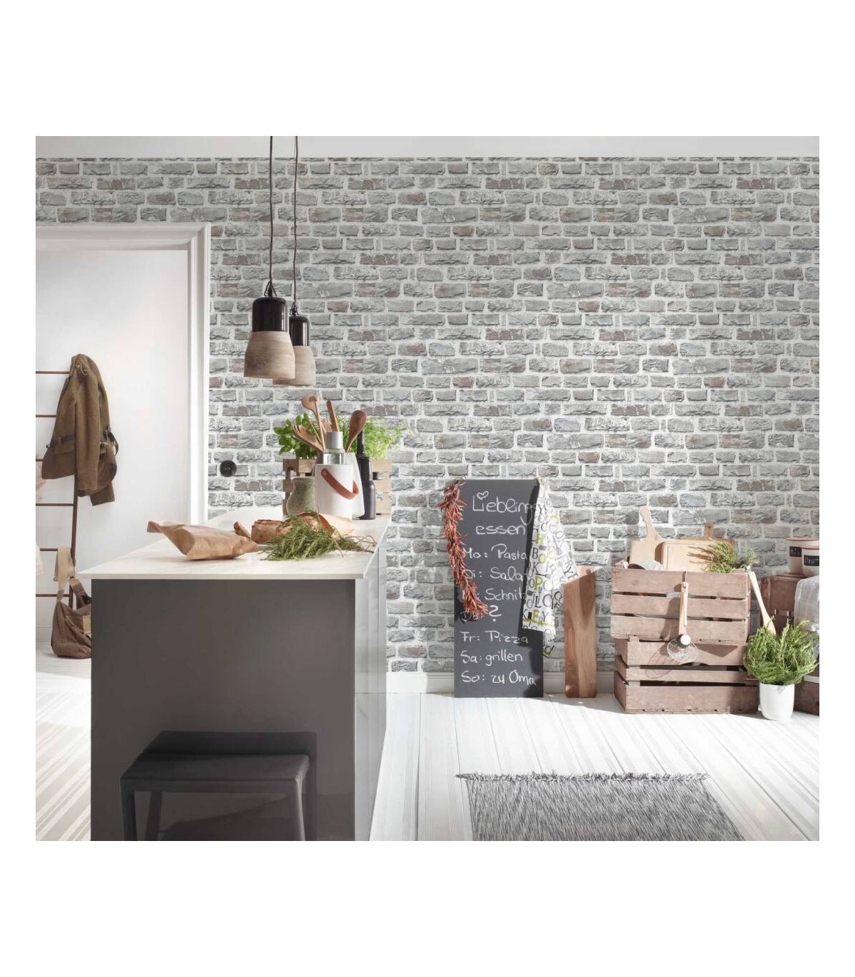 Rouleau 0,53x10,05 m, Raccord sauté de 64/32 cm. Couleur: gris, multicolore. Décor: déco / motif, maison, pierre. Pièce: bureau, chambre, couloir, cuisine, salon. Qualité: Bonne résistance, Brossable, Strippable.
