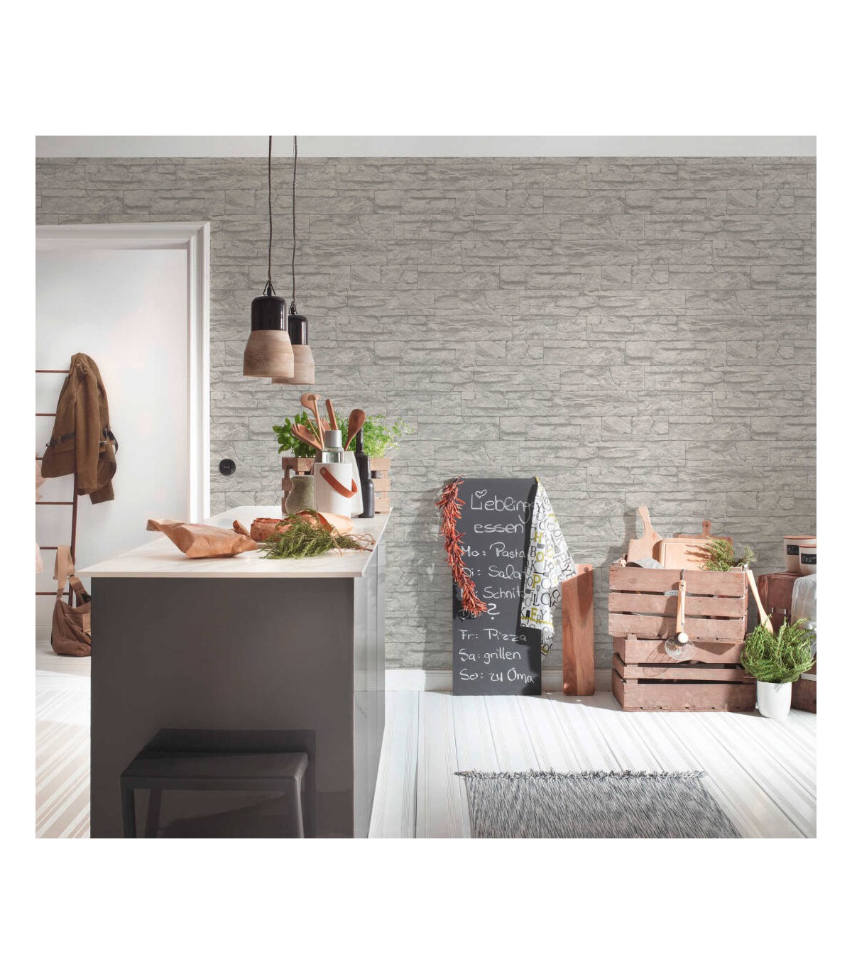 Rouleau 0,53x10,05 m, Raccord sauté de 64/32 cm. Couleur: blanc, gris. Décor: déco / motif, moderne, pierre, structure. Pièce: chambre, couloir, cuisine, salle de bains, salon. Qualité: Bonne résistance, Brossable, Strippable.