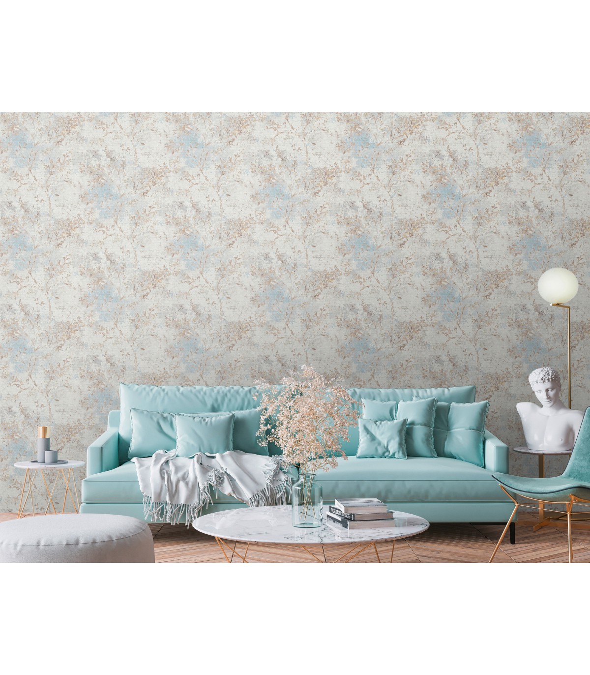 Rouleau 0,53x10,05 m, Raccord sauté de 64/32 cm. Couleur: beige, blanc, bleu, doré, gris, taupe. Décor: floral, textile. Pièce: chambre, couloir, cuisine, salon, surface à tapisser. Qualité: Bonne résistance, Brossable, Strippable.