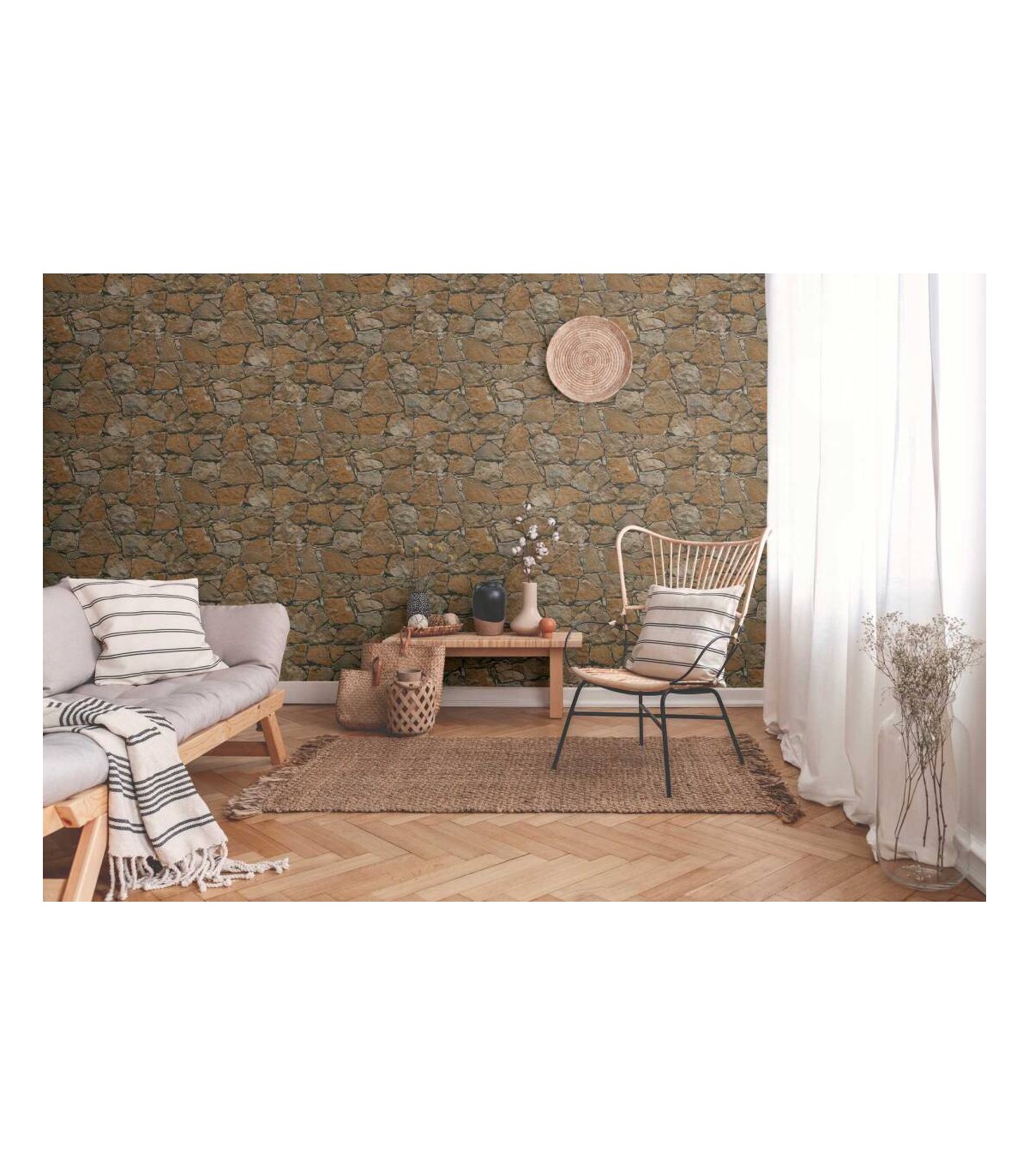 Rouleau 0,53x10,05 m, Raccord sauté de 53/26 cm. Couleur: beige, marron, noir. Décor: maison, moderne, pierre. Pièce: bureau, chambre, cuisine, salle de bains, salon. Qualité: Bonne résistance, Brossable, Strippable.