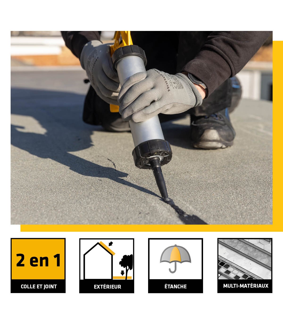 Sa formule sans odeur, à polymérisation neutre reste souple même à basse température et ne flue pas, assurant un joint durable et parfaitement étanche. Ce produit est facile à lisser, et offre une très bonne résistance aux UV, intempéries et au vieillissement naturel.