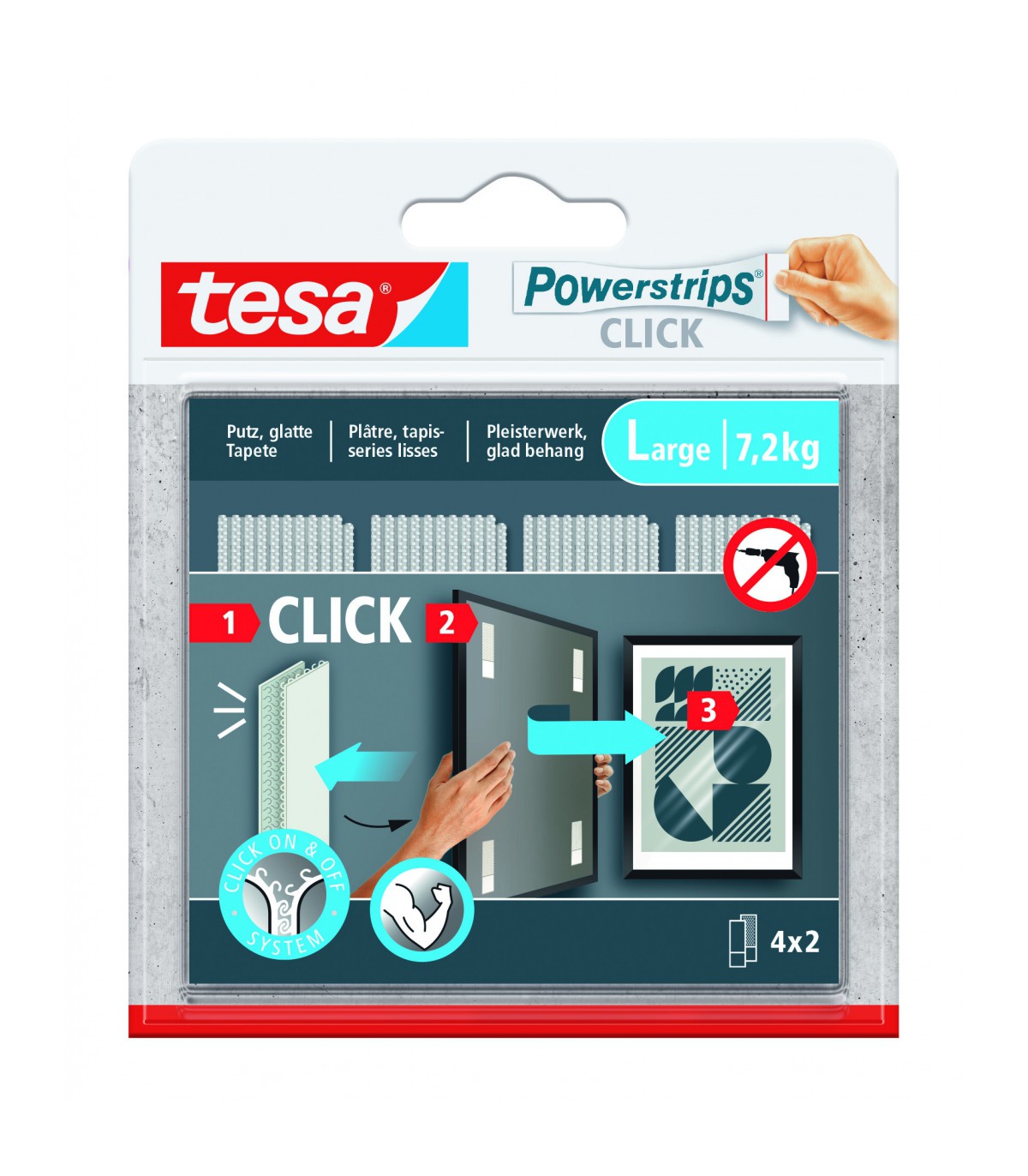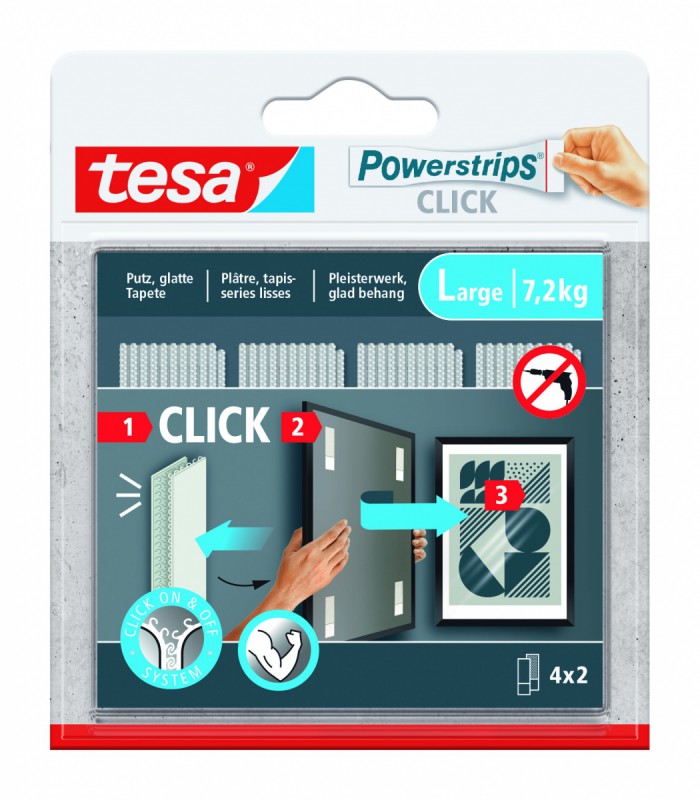 Ces languettes adhésives Powerstrips CLICK sont spécialement conçues pour la fixation sans perçage de cadres et décorations murales plates. Grâce à leur système ingénieux « clic », elles permettent de fixer en toute sécurité les cadres sur le montage collé au mur, tout en offrant une grande flexibilité : on peut facilement redécorer sans changer la languette adhésive. De plus, le retrait est possible sans laisser de traces, même après plusieurs utilisations.