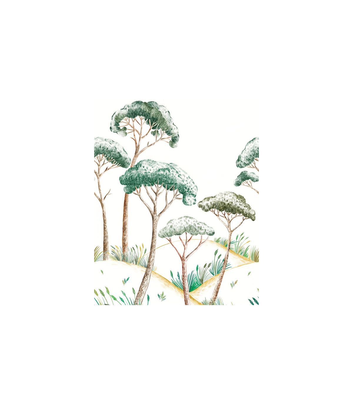 Retour du pin, cet arbre si spécifique des bords de mer escarpés mis à l’honneur lors de notre collection végétale MOONLIGHT2. Ici, pas de voyage en clair-obscur, mais un paysage panoramique simple et efficace qui trouvera sa place sur un grand mur de salon ou pour apporter une touche de verdure dans un vaste couloir.