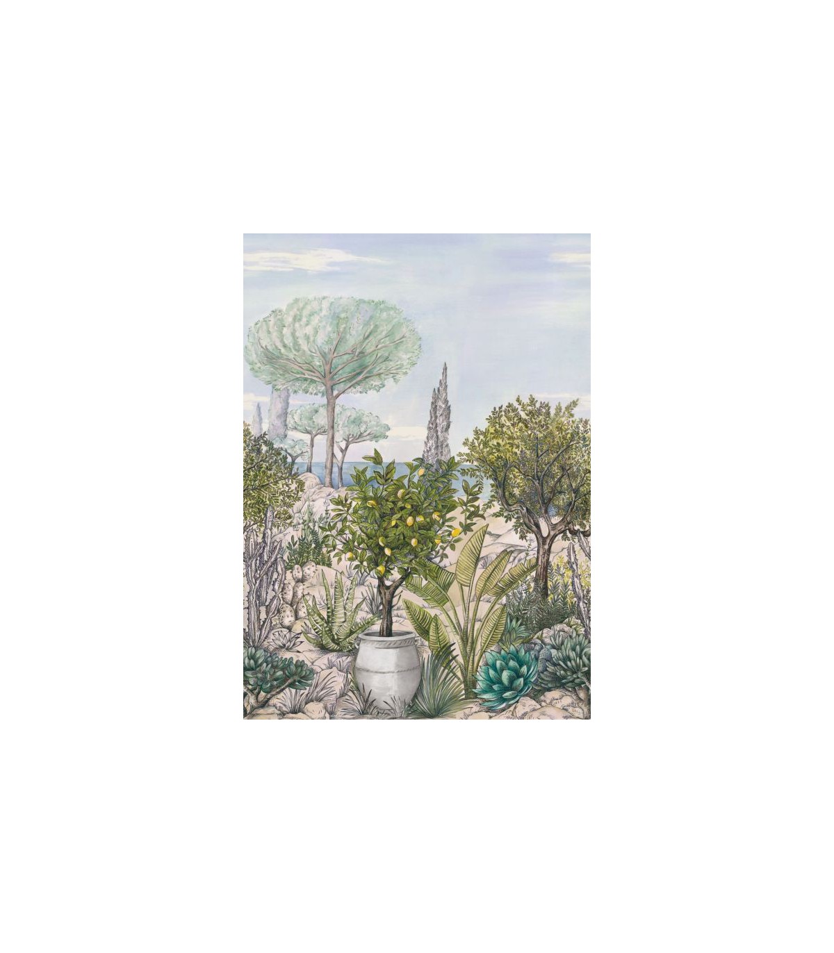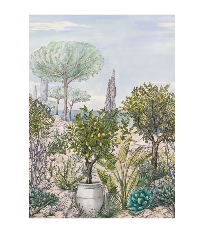Le papier peint panoramique prend tout son sens avec ce paysage provençal avec vue sur mer. Son trait de crayon si spécifique et ses jolies couleurs douces évoquent les paysages des livres de gravure. Un paysage réaliste et authentique pour apporter un peu de Méditerranéen dans la déco de la maison.