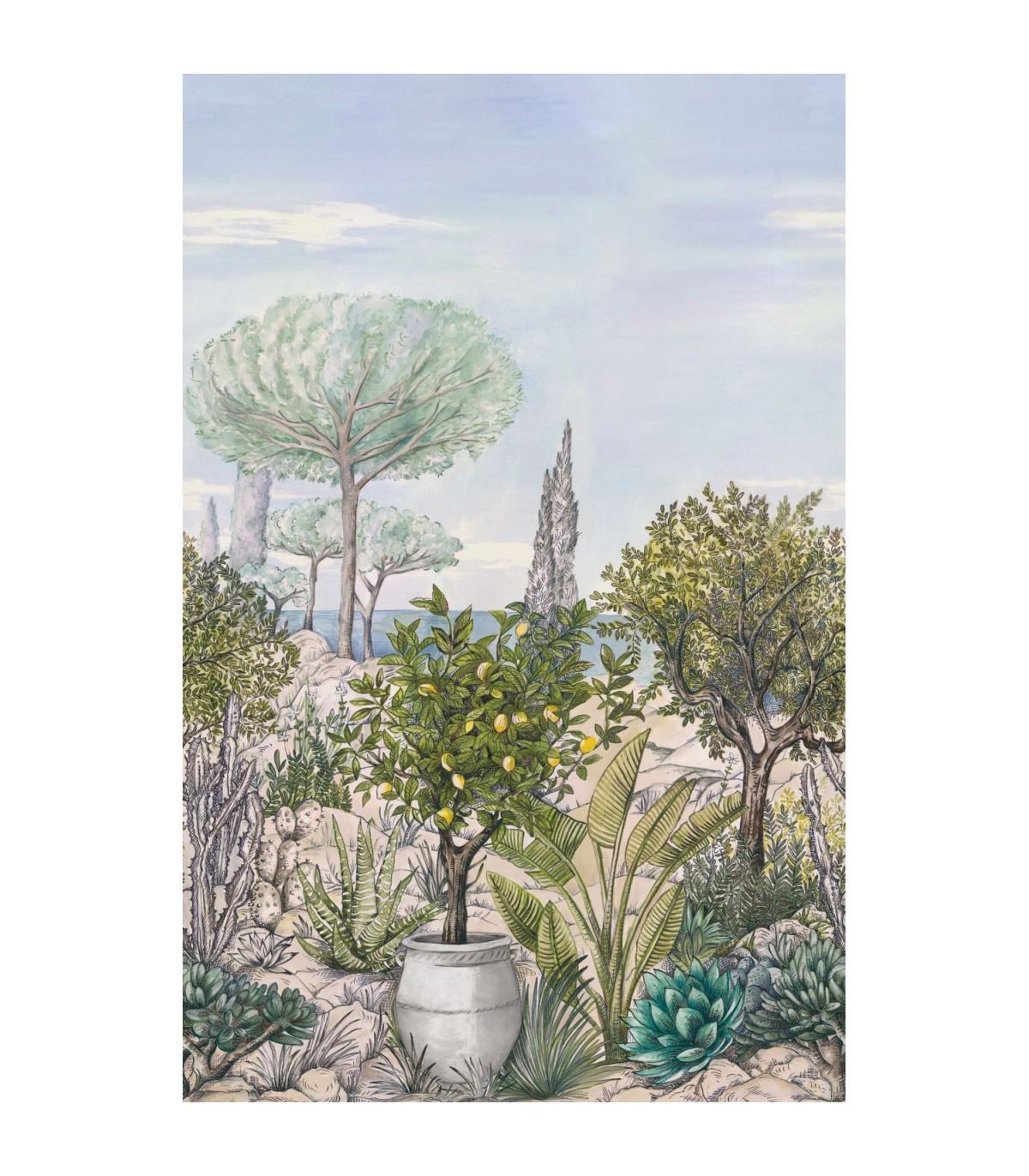 Le papier peint panoramique prend tout son sens avec ce paysage provençal avec vue sur mer. Son trait de crayon si spécifique et ses jolies couleurs douces évoquent les paysages des livres de gravure. Un paysage réaliste et authentique pour apporter un peu de Méditerranéen dans la déco de la maison.