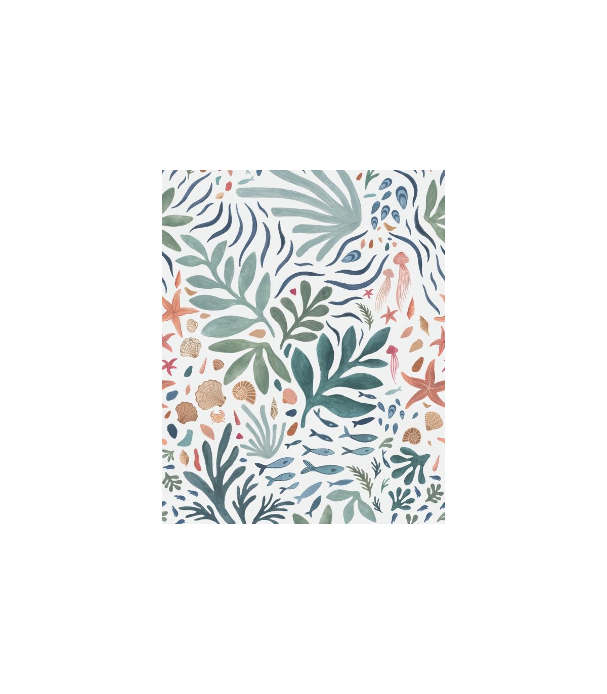 Paris-Seychelles, c’est parti. Direction les tropiques avec un papier peint panoramique qui mixent coraux, coquillages et crustacés. Le tout dans une belle palette de couleurs récifales : des bleus, des coraux, des verts d’eau…