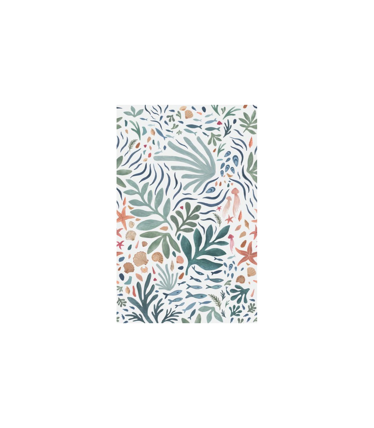 Paris-Seychelles, c’est parti. Direction les tropiques avec un papier peint panoramique qui mixent coraux, coquillages et crustacés. Le tout dans une belle palette de couleurs récifales : des bleus, des coraux, des verts d’eau…