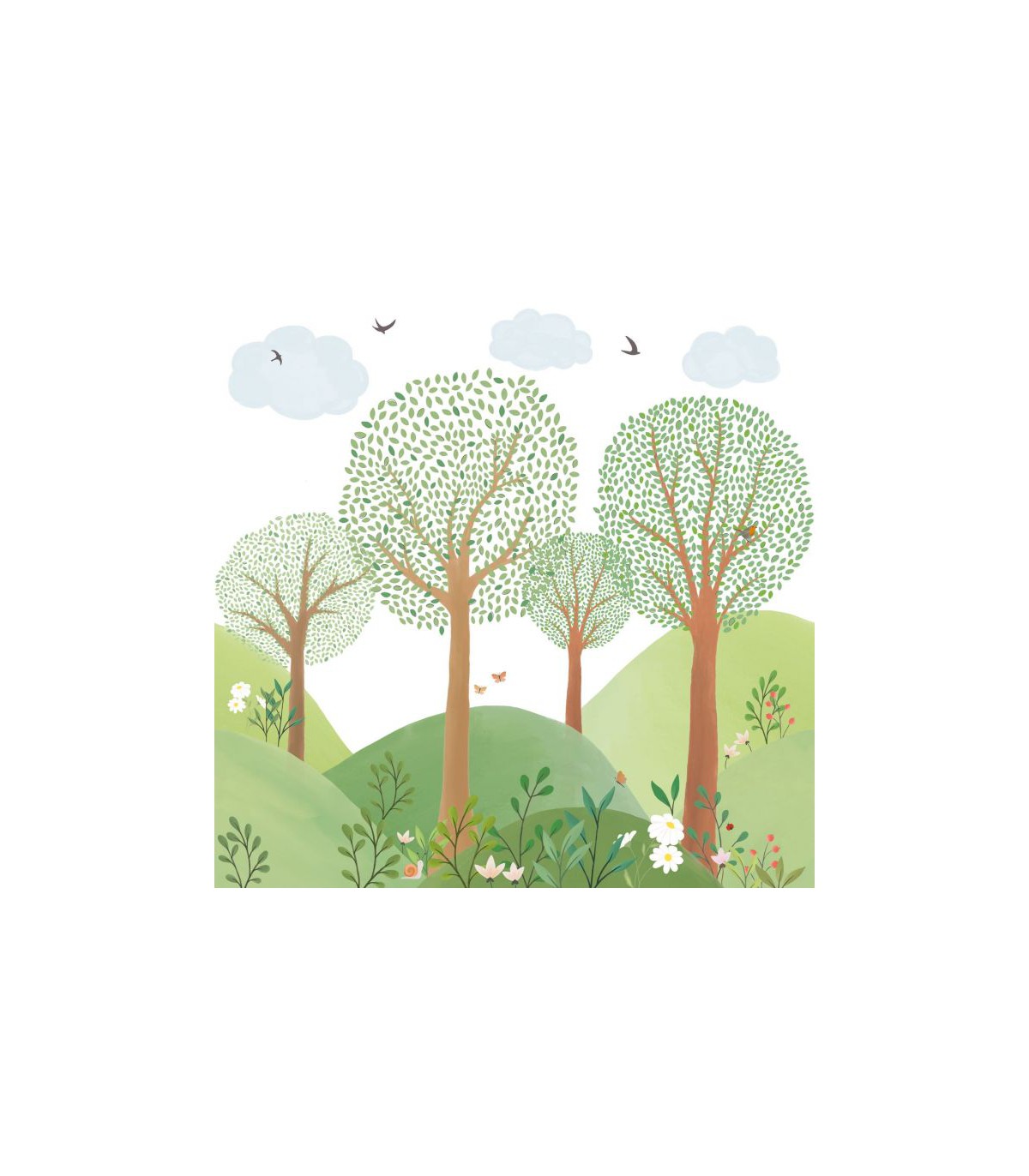 C’est un paysage de forêt de livres de contes qu’on vous propose avec ce panoramique aux coloris lumineux et naïfs. Le petit plus : on vous laisse la liberté de positionner les animaux de la forêt (livrés sur une planche autocollante) là où vous voulez.