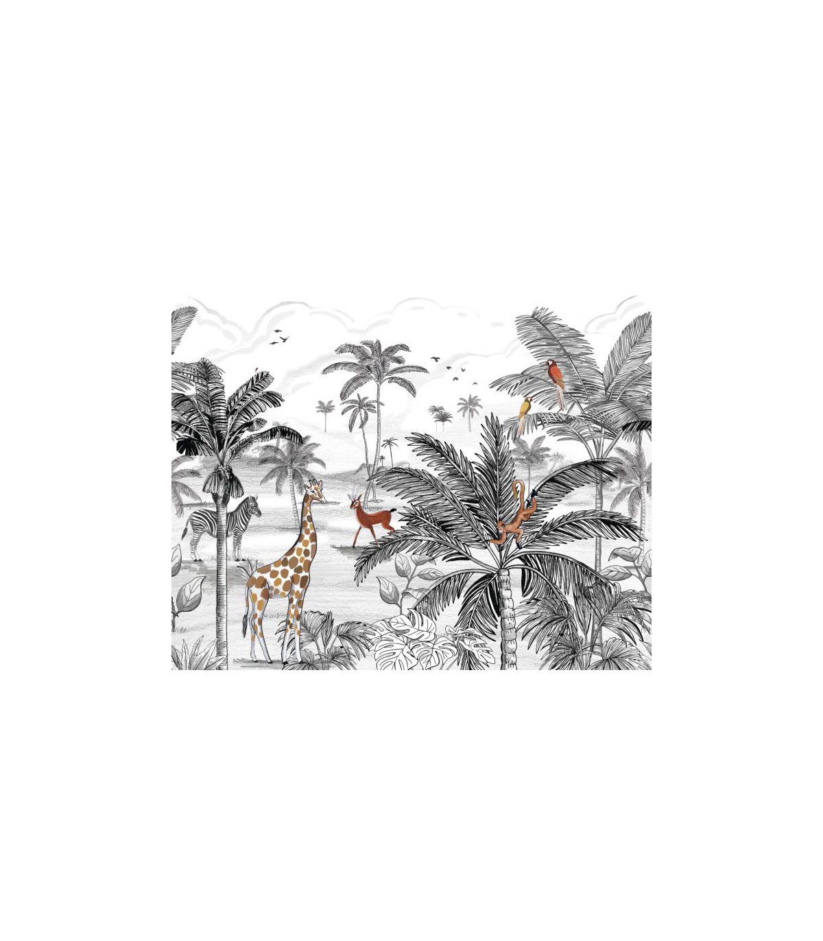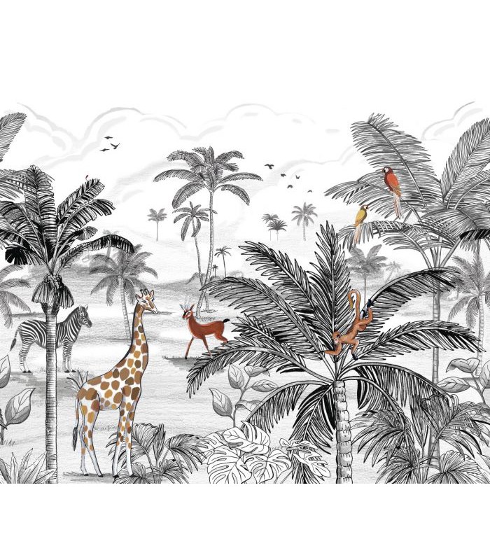 Hop, on prend l’appareil photo et on s’offre un safari photo sans bouger d’ici ! C’est à travers deux motifs au style différent que s’ouvre le monde de la jungle. Le premier très animalier nous offre une vue de safari avec ses animaux dessins au crayon. Le second plus végétal nous plonge dans la luxueuse jungle. En voyage !